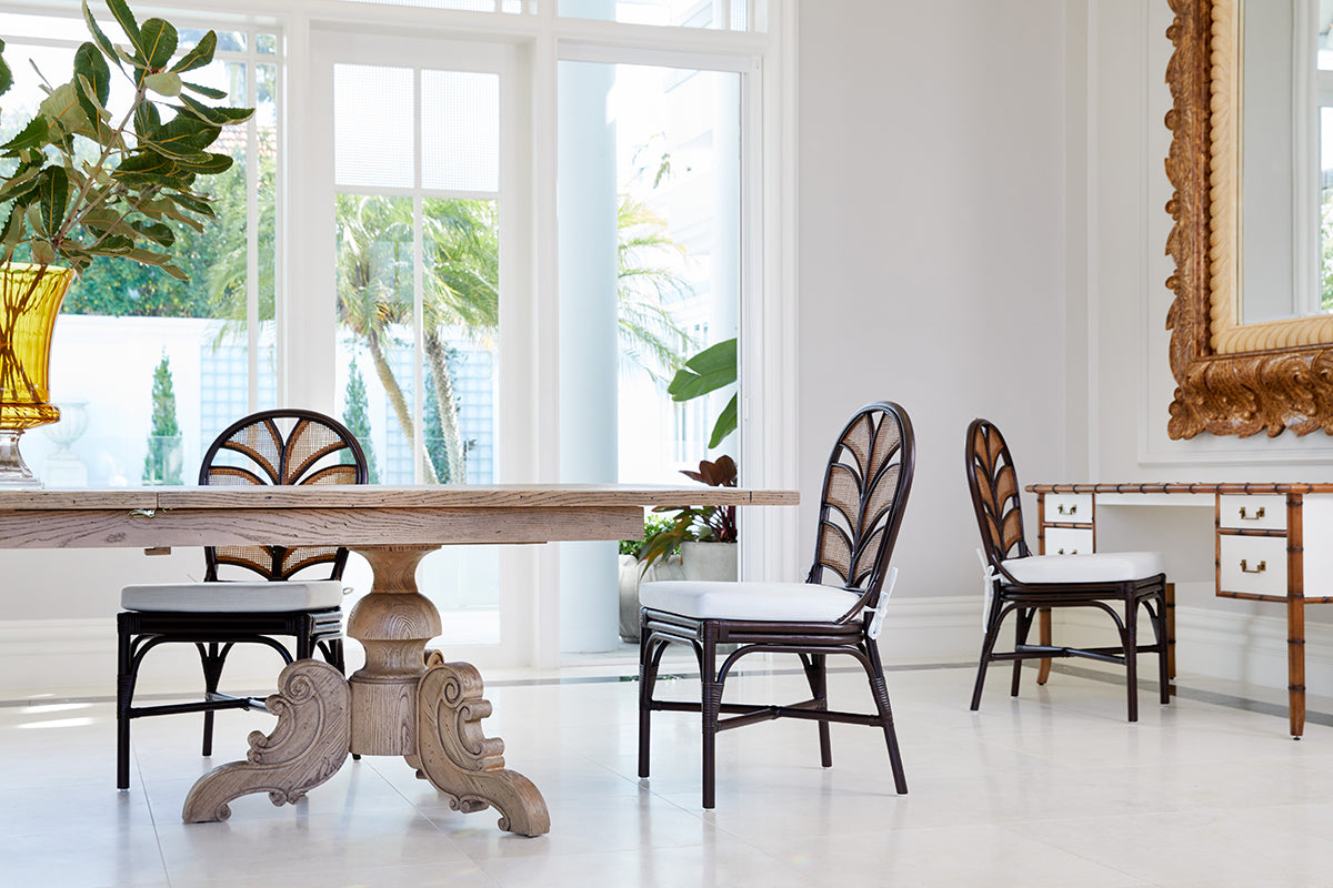 Each Dominica Dining Chair features meticulously handwoven mesh inlaid to achieve a delicate and refined finish. This artisanal touch adds a sense of luxury and texture, making it a captivating statement piece for any setting.