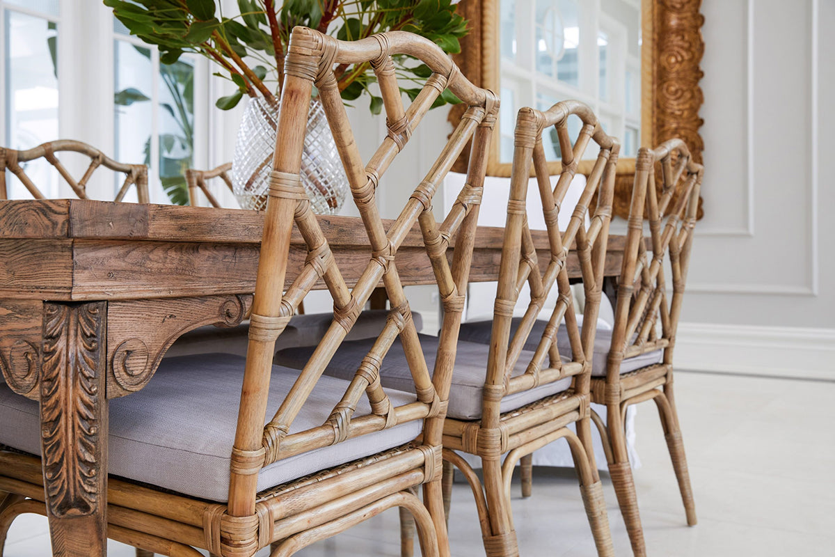 Introducing our exquisite Dynasty Dining Chair, inspired by the timeless Chippendale designs. Each chair is meticulously handcrafted from sustainable old growth rattan, sourced from responsible plantations.