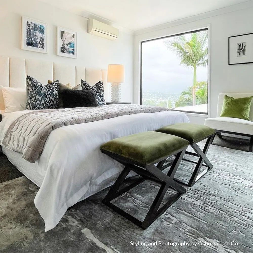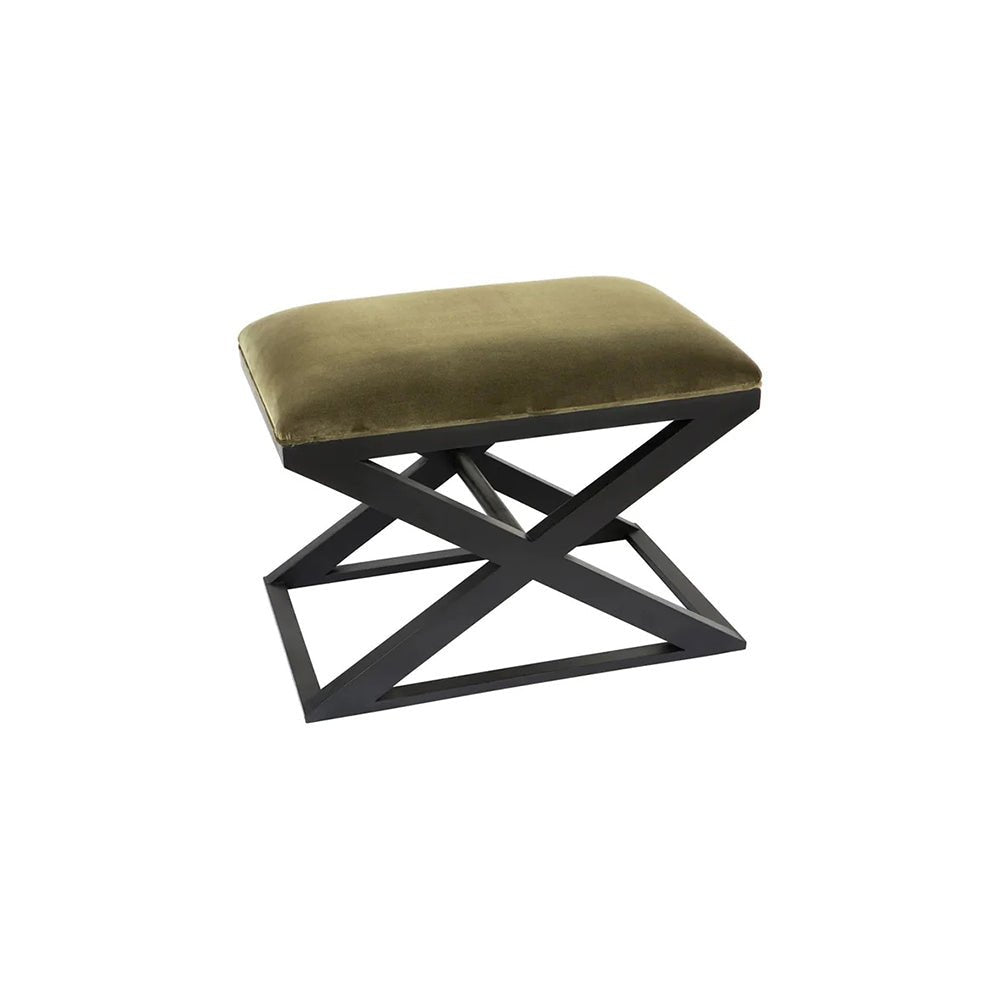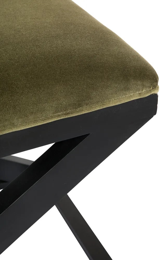 A stylish cross legged timber frame in a smooth black finish provides a classic base for the Spencer Dressing Table stool in moss. Its aptly cushioned top is upholstered in a gorgeous moss coloured velvet.
