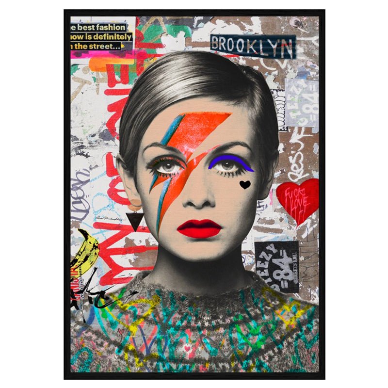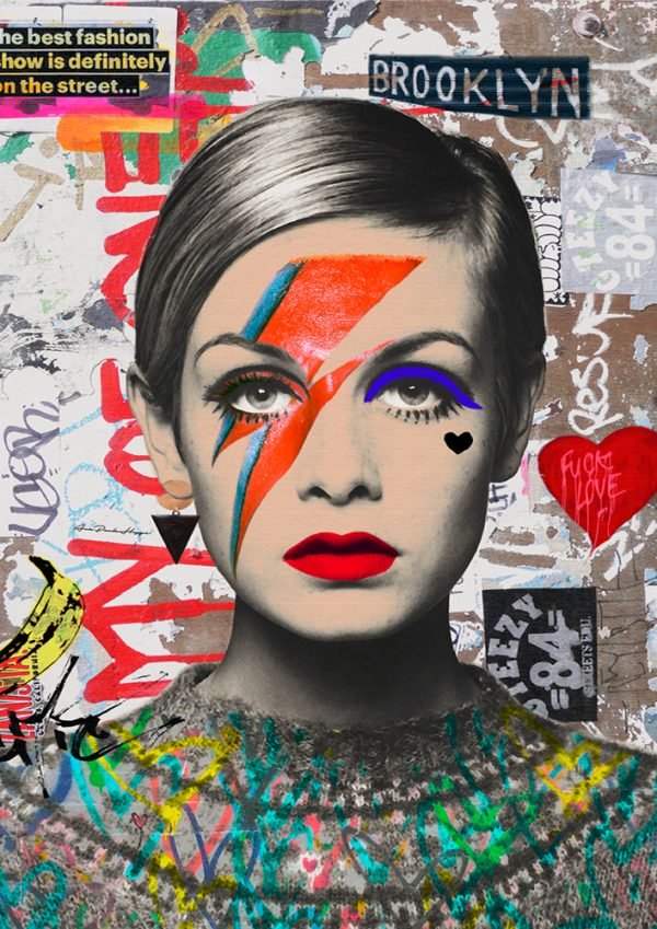 This eclectic pop art design is a true celebration of the fabulous Dame Lesley Lawson, widely known as Twiggy - an iconic figure of the swinging '60s in London. With her effortless style and undeniable charisma, Twiggy became a cultural icon and a prominent teenage model.