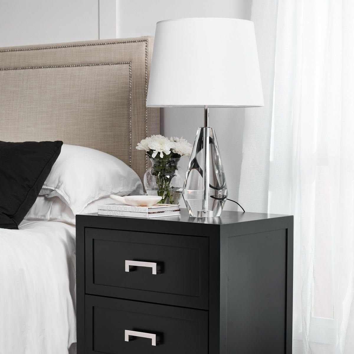 The Sorrento bedside table exudes understated sophistication with its sharp, contemporary lines and refined shaker panelling. Finished in satin black, it offers generous drawers and bespoke handle choices—brushed silver, brass, or black—ensuring it complements any space, large or small.