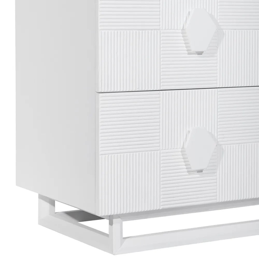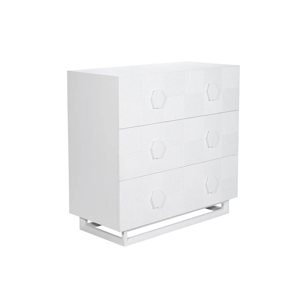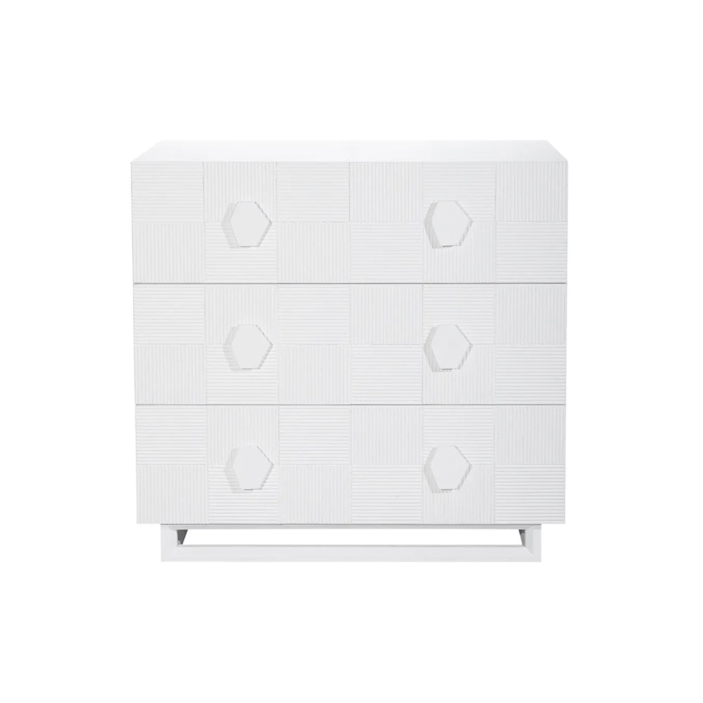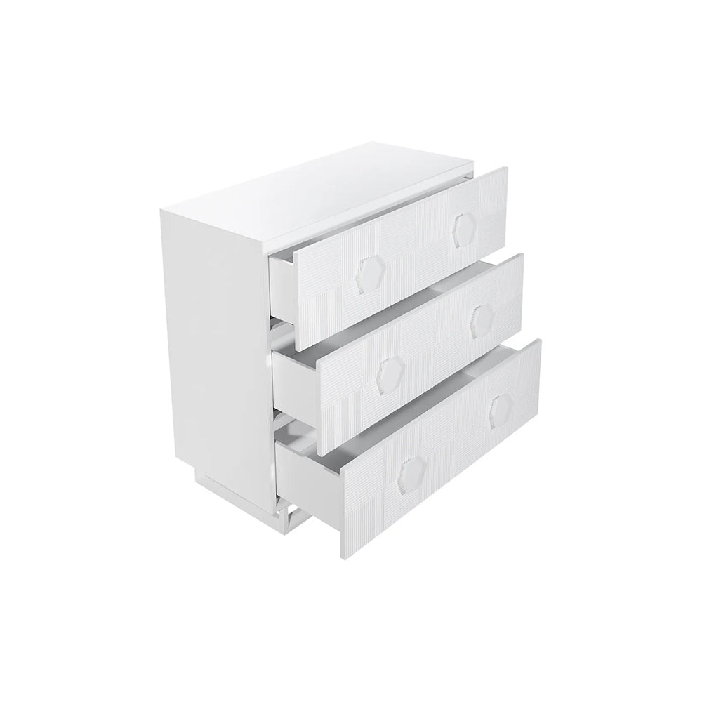 Effortlessly chic, the Astoria 3 Drawer Chest in white blends modern design with timeless sophistication. Featuring a crisp geometric pattern and sleek hexagonal handles, this piece brings fresh elegance to any interior. Perfect for Australian homes, it offers generous storage while enhancing your space with its clean, versatile aesthetic—ideal for creating a serene and stylish atmosphere.