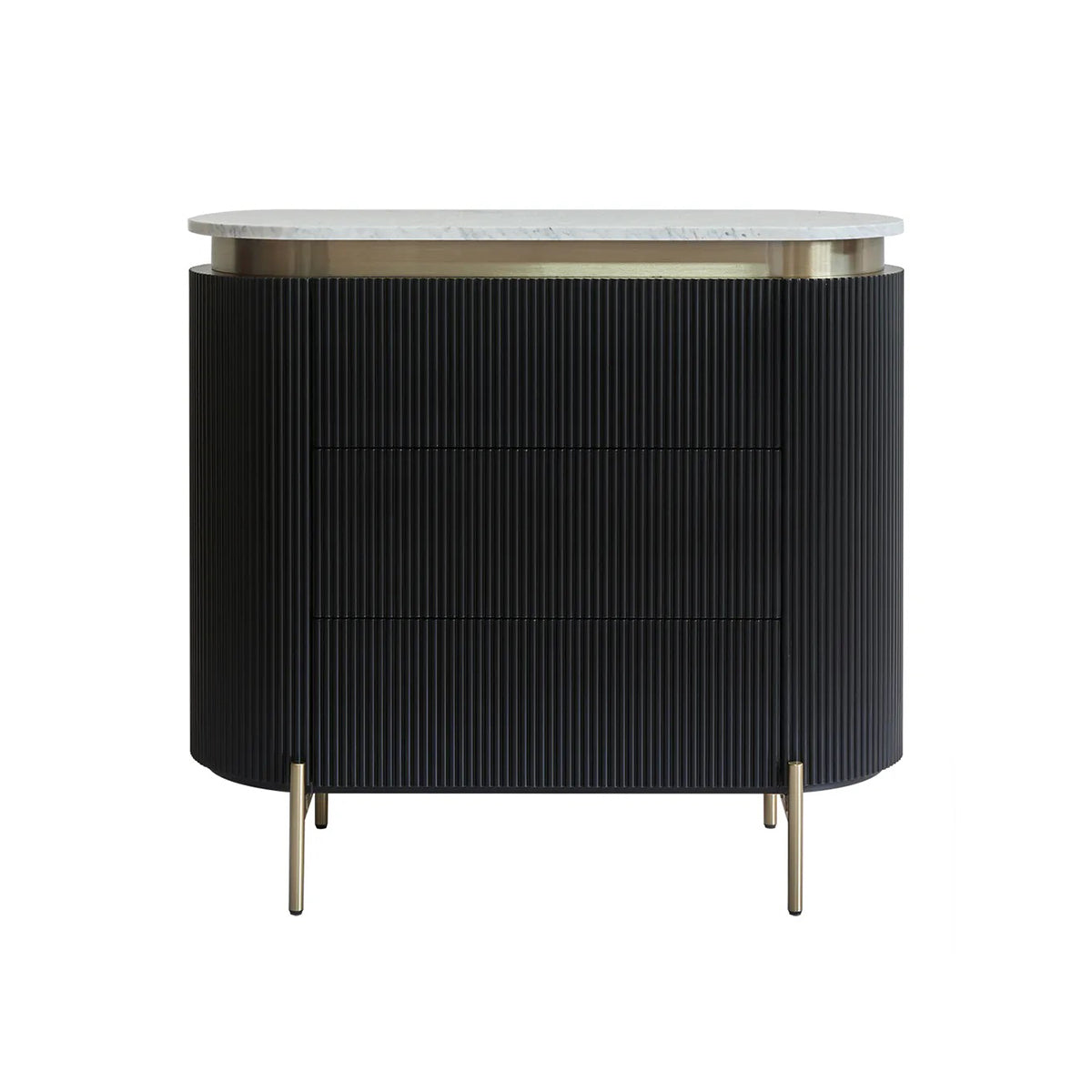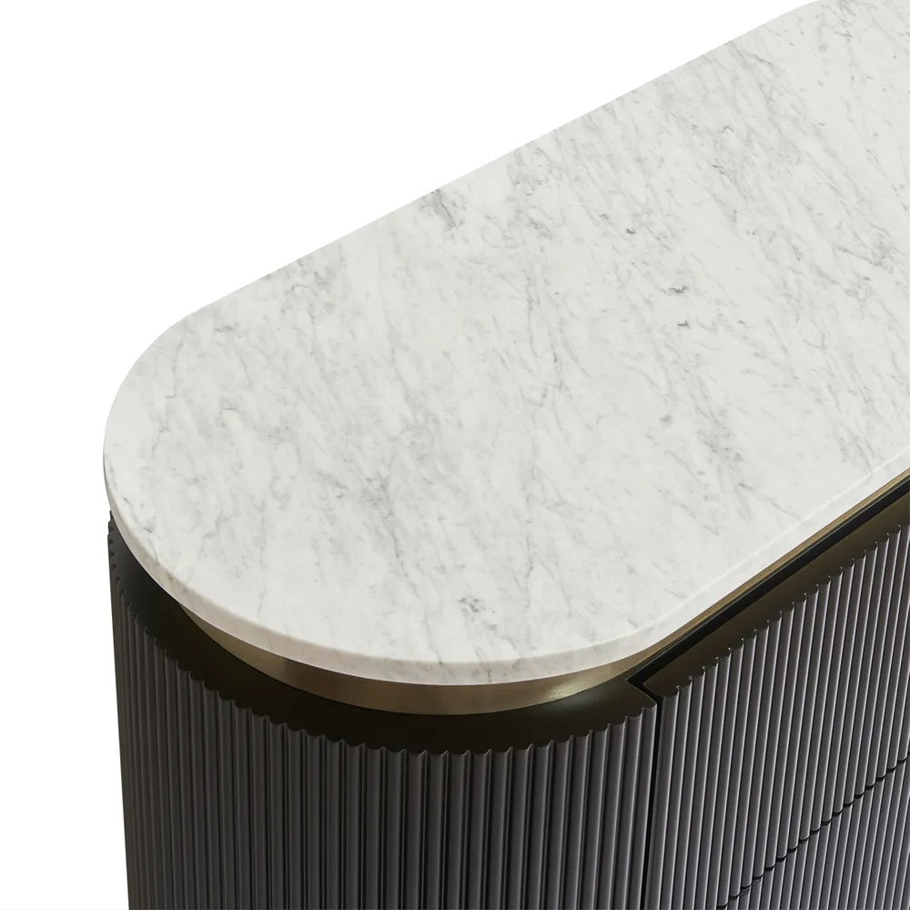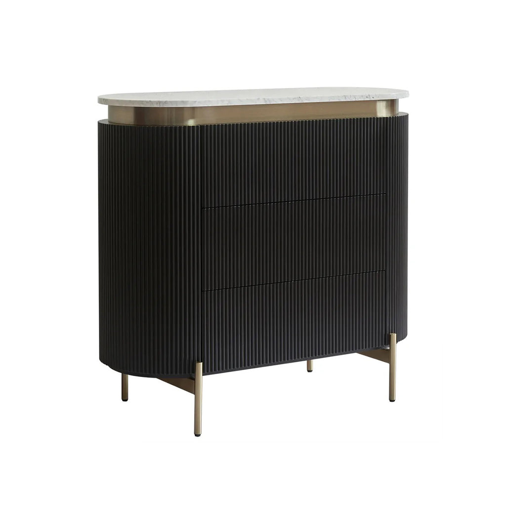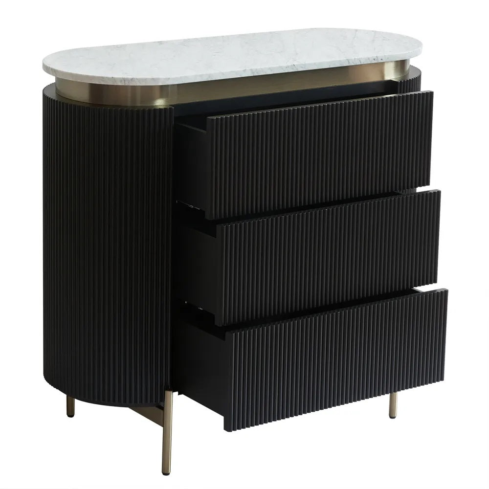 Introducing the Monte Carlo chest of drawers in black —where modern craftsmanship meets bold sophistication. Dressed in stunning black with a ribbed texture and sleek brass accents, this beauty features a gracefully curved white Carrara marble top. With three spacious drawers and streamlined brass legs, it combines functionality with a dash of glamorous charm, effortlessly elevating any bedroom or living space.