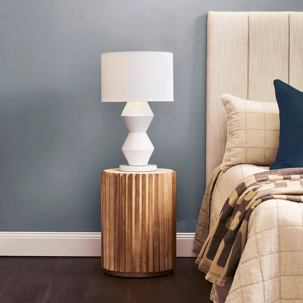 The bold lines of the Abstract White Table Lamp creates a dramatically stunning silhouette. A contemporary matte white finish adorns the resin lamp base and plays on the sharp design of the form. Topped with a white linen drum shade. Finishes may vary slightly.