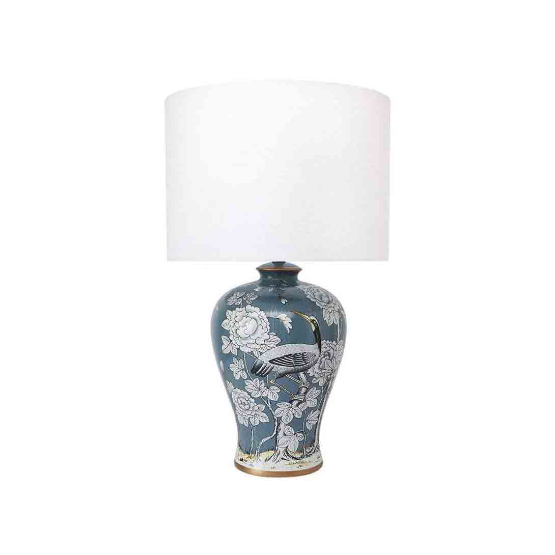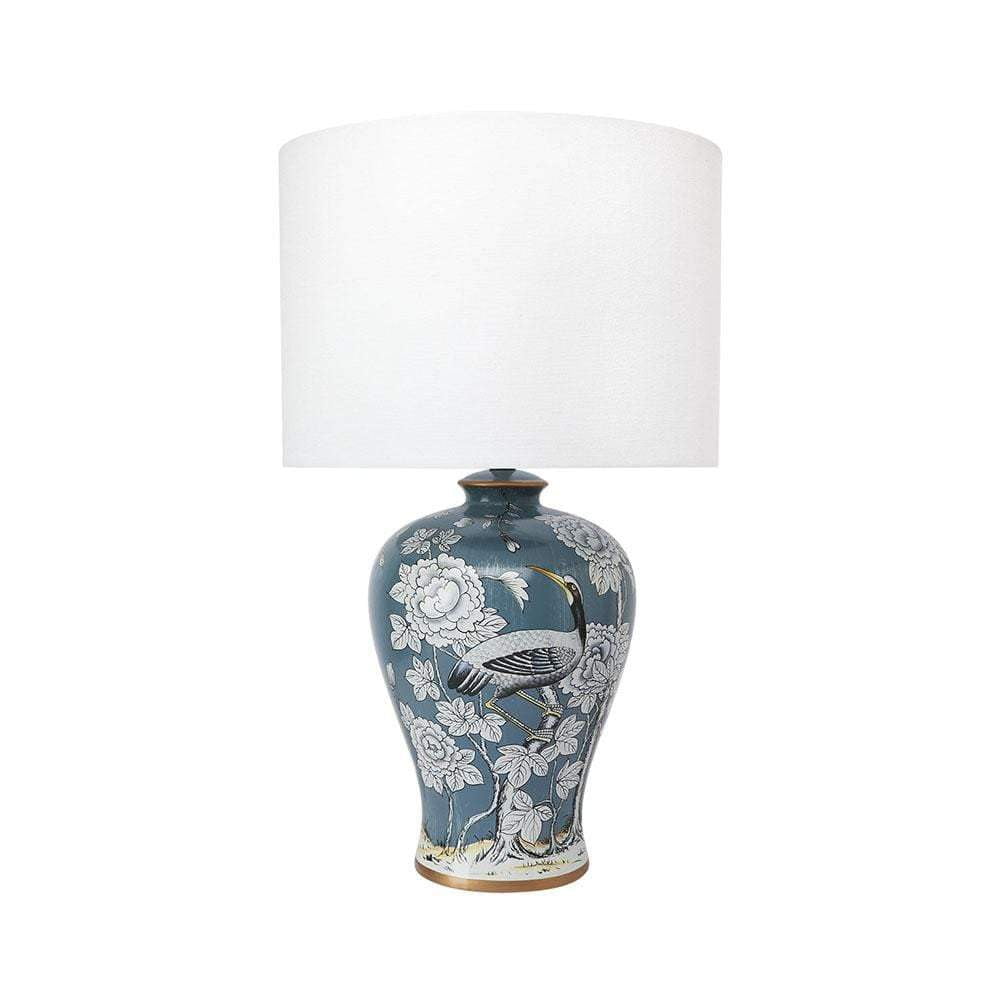 Inspired by numerous trips to the Orient, this lamp is reminiscent of eastern dynasties of bygone years. The ceramic base has a delicate chinoiserie design which sits atop a crystal base. The sky blue background sets a relaxing note for any room. This lamp is subtlety accented with a white linen shade.