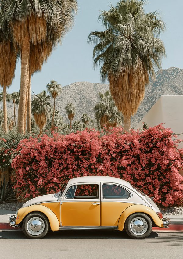 A celebration of vintage charm and sun-drenched style, Barney Beetle captures a classic Beetle set against palms and vibrant blooms. Playful yet effortlessly cool, it evokes retro road trips and carefree summer days. A statement piece that brings warmth, nostalgia, and personality to any interior.