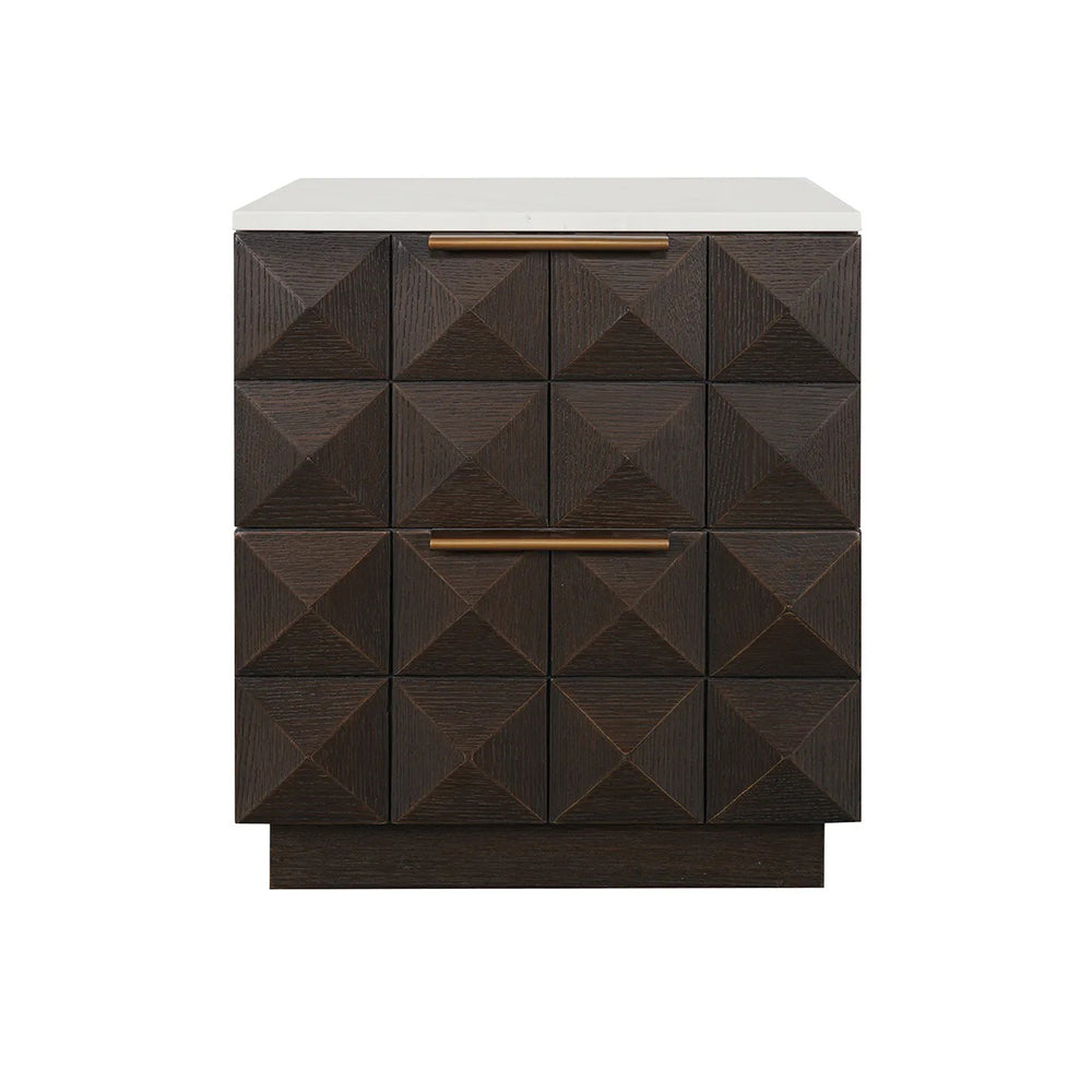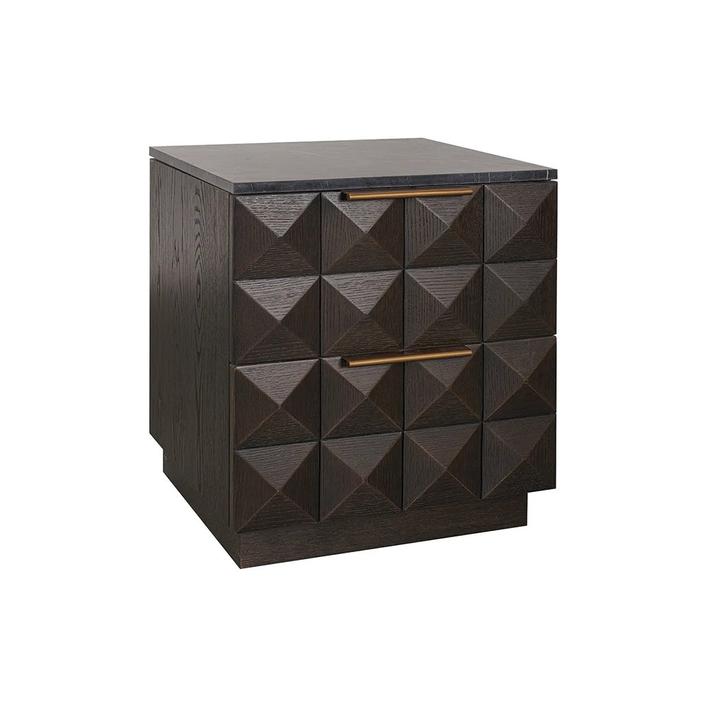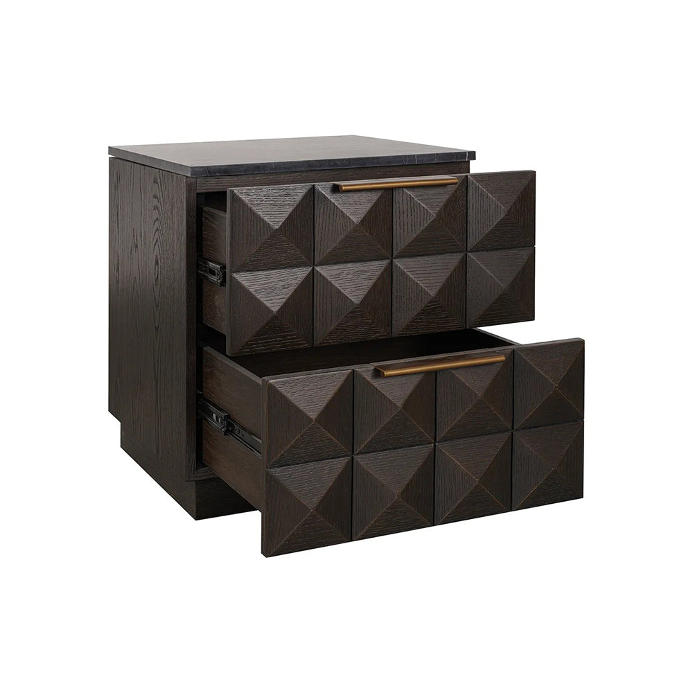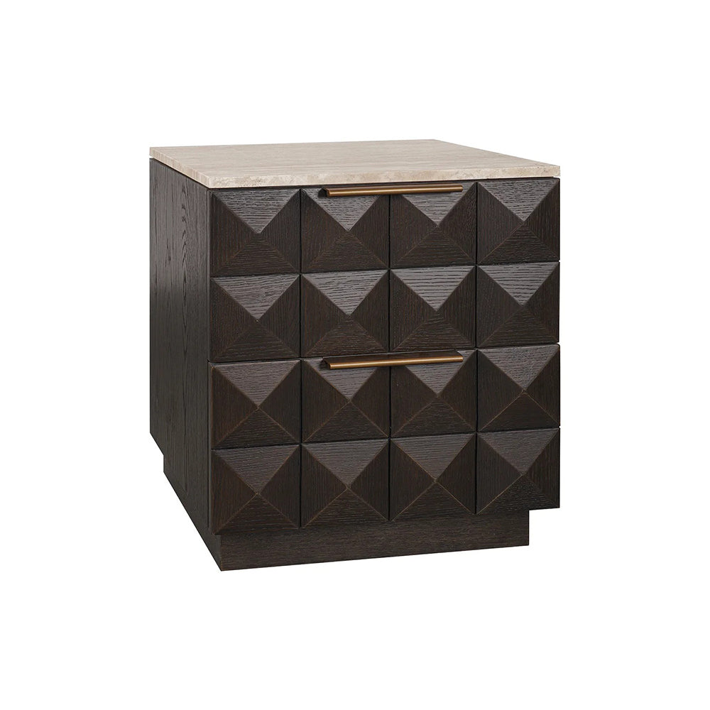 The Benedict Smoked Oak Bedside Table Range delivers bold sophistication with its sculptural geometric timber façade and refined brass detailing. Deep smoked oak tones add warmth and drama, while two spacious drawers provide practical bedside storage. Available with travertine, white marble, black marble or river brown marble tops, offering versatility across contemporary interiors.