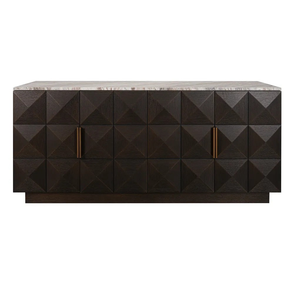 The Benedict Smoked Oak Buffet combines bold architectural design with refined natural materials. Its sculptural geometric façade showcases the richness of smoked oak, creating dramatic depth and texture, while elegant brass handles add warmth and sophistication. Finished with a choice of luxurious stone tops, the Benedict offers both striking design and practical storage, making it a standout centrepiece for contemporary and designer interiors.