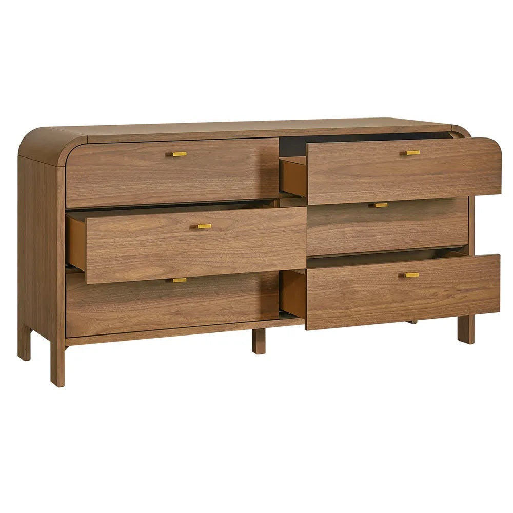 Prepare to elevate your interiors to the heights of sophistication with the Carmen 6 Drawer Chest in walnut, a design that transcends the confines of time with its enduring allure. This piece boasts a gently curved silhouette expertly fashioned from ash wood veneer, kissed by a rich and warm walnut painted finish.