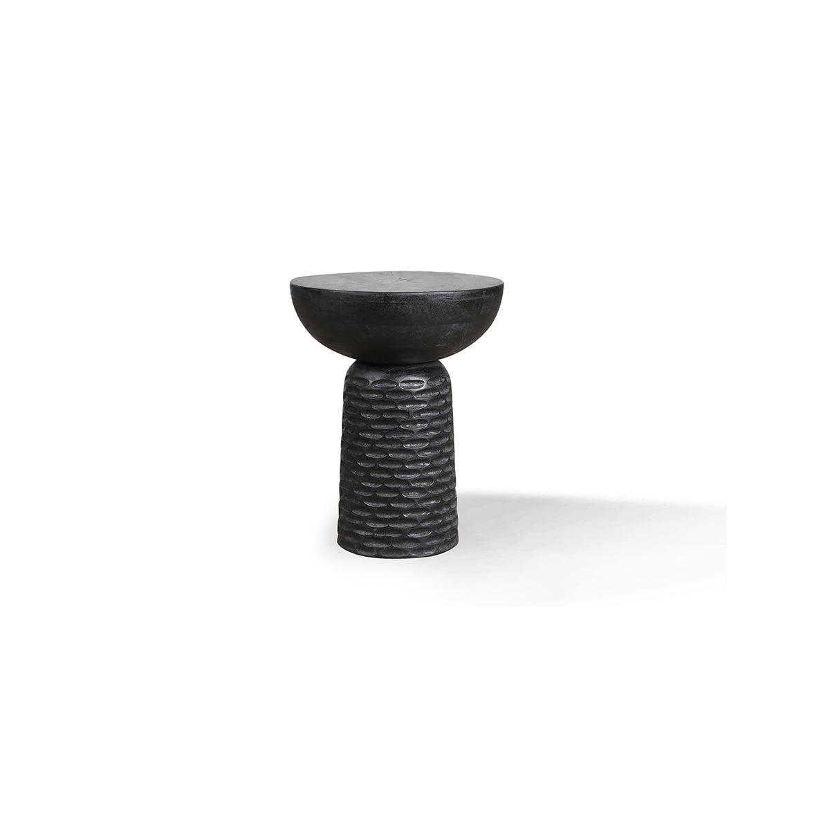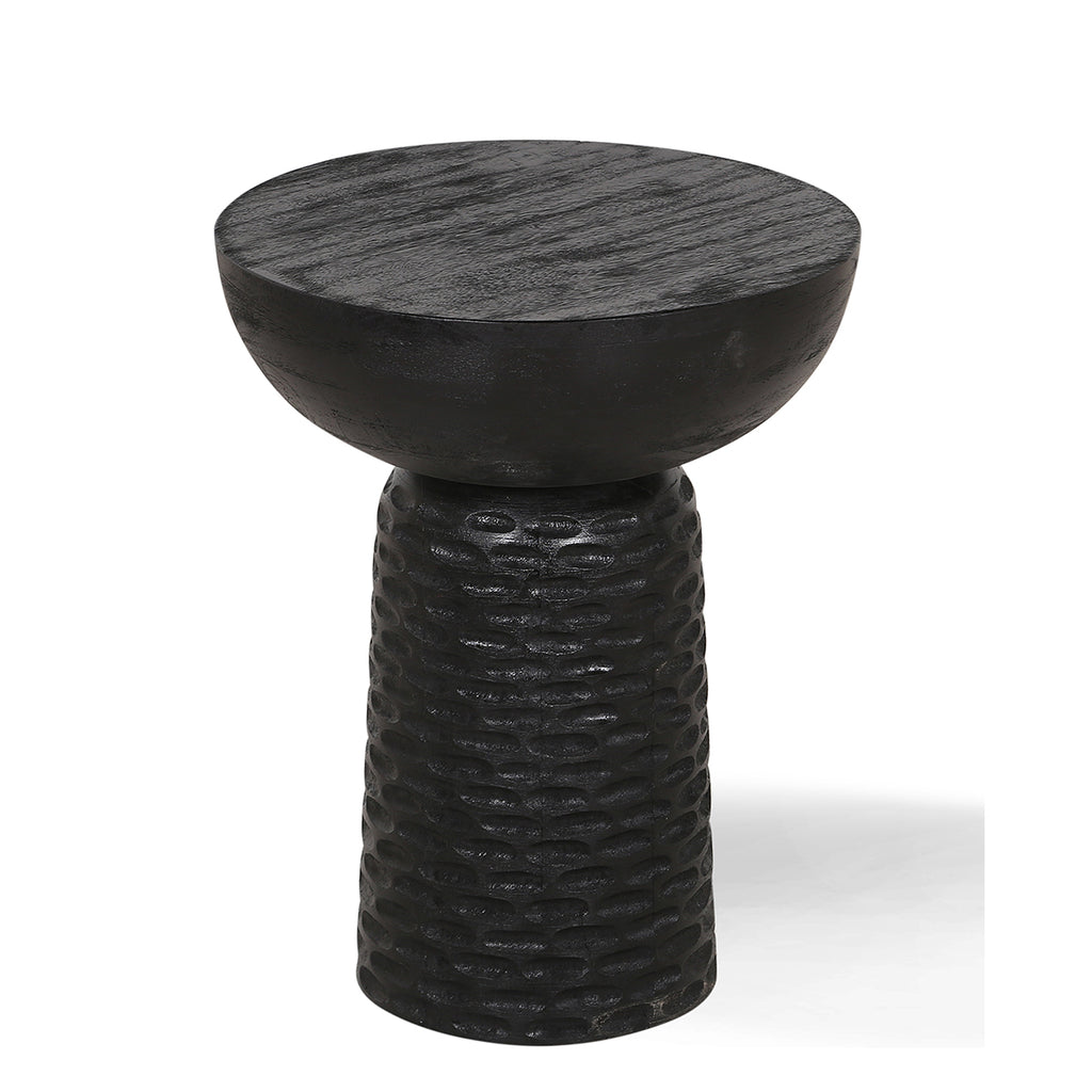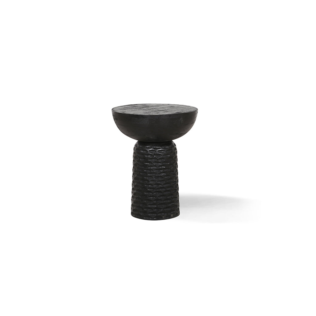 Sculptural and striking, the Udaipur Side Table combines a textured base with a smooth curved top. Its bold silhouette adds depth and modern elegance to any space. Perfect for holding your favourite book, a chic table lamp, or a cup of coffee, this versatile black side table adds both style and function. Small yet impactful, it’s an effortless way to elevate your room's design while keeping essentials within reach.