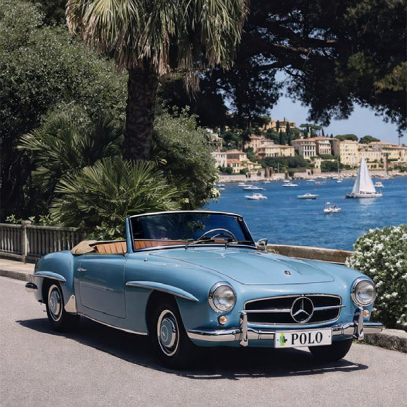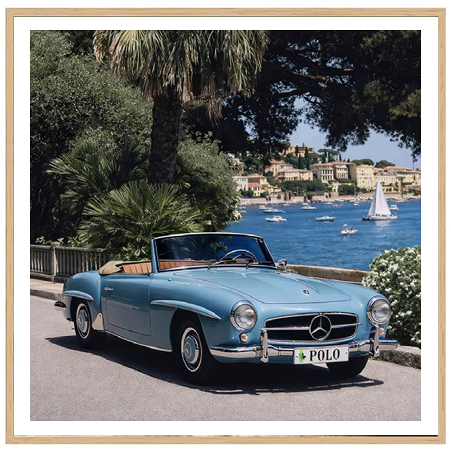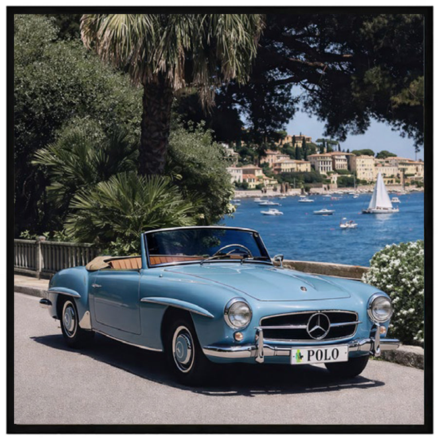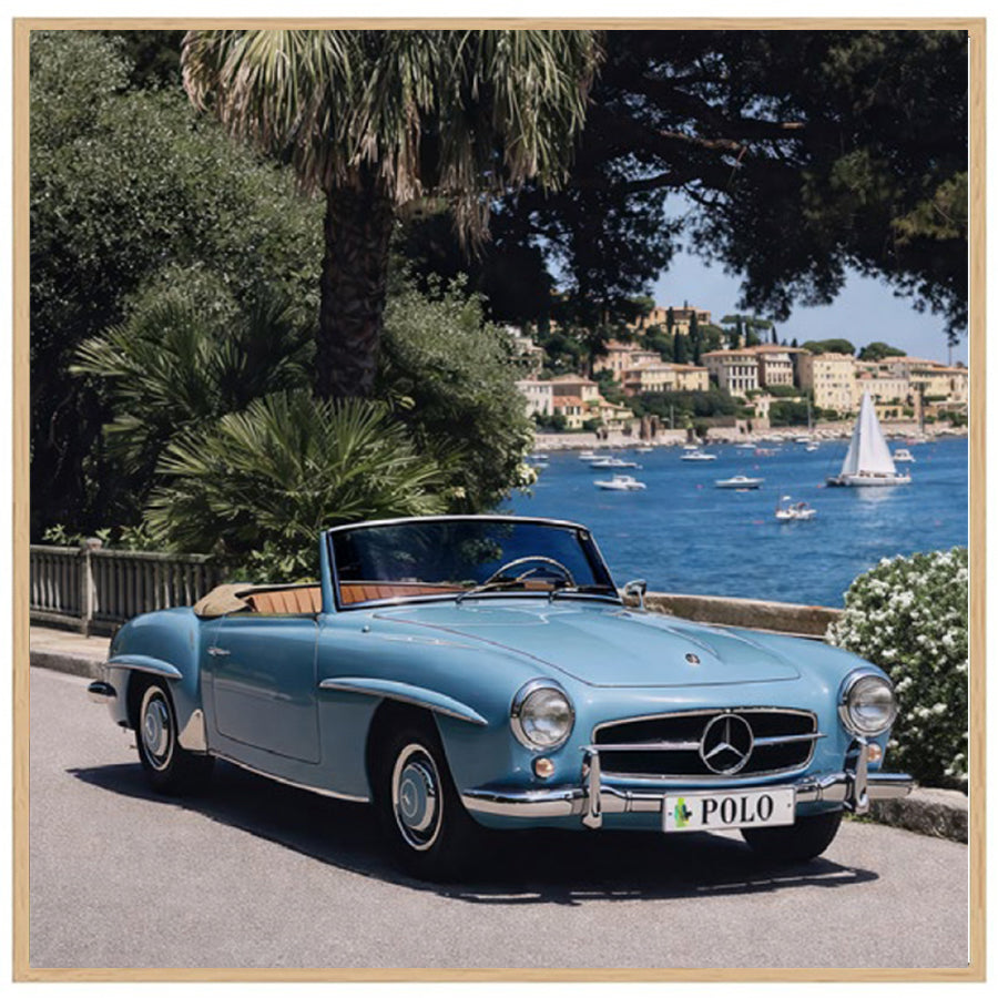 Cruise captures the romance of Riviera travel, featuring a classic open-top roadster gliding along a sunlit coastal promenade. Framed by palms and sparkling blue waters, this refined artwork evokes timeless European leisure, bringing relaxed sophistication and effortless luxury to elegant contemporary interiors.