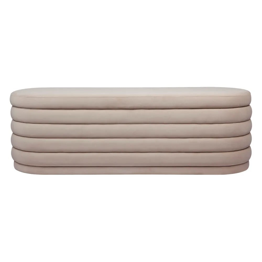 Upholstered in sumptuous nude velvet, the gentle tones and softened profile of the Demi storage bench ottoman lends a sense of sophistication to any space. Designed with an effortlessly chic cosmopolitan mood in mind, the panelling detail of the Demi storage bench ottoman enhances its textural quality and adds to its contemporary curve appeal.