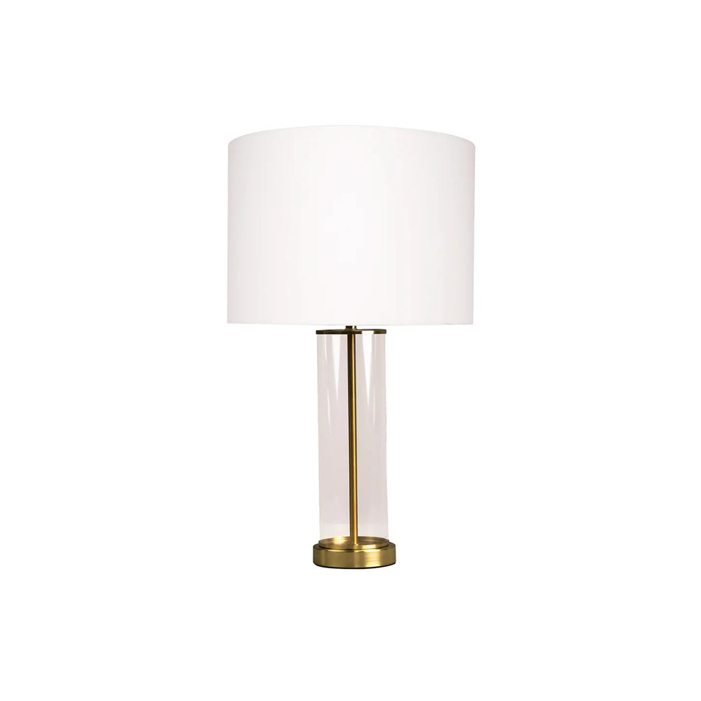 Elevate your space with the East Side Table Lamp, a perfect blend of modern style and timeless elegance. Featuring striking metallic brass details, this lamp seamlessly complements both contemporary and classic interiors. The sleek glass cylindrical base with brass accents adds a sophisticated touch, while the white drum shade exudes gentle, radiant light that brings a touch of glamour to any room. Standing at 61cm tall, the East Side Table Lamp offers a lightweight, graceful presence, making it an ideal choice for bedrooms, living rooms, or as a stylish addition to an entry console. Perfect for adding a subtle yet refined glow, this lamp is a must-have accent piece for any home.