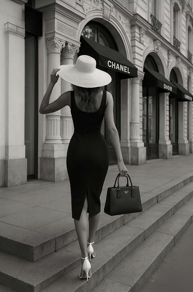Fashion House Walk captures the elegance of Parisian couture culture, featuring a poised silhouette ascending grand stone steps beneath iconic fashion houses. This striking black-and-white print evokes timeless sophistication, elevating interiors with refined European glamour and a sense of effortless, high-fashion allure.