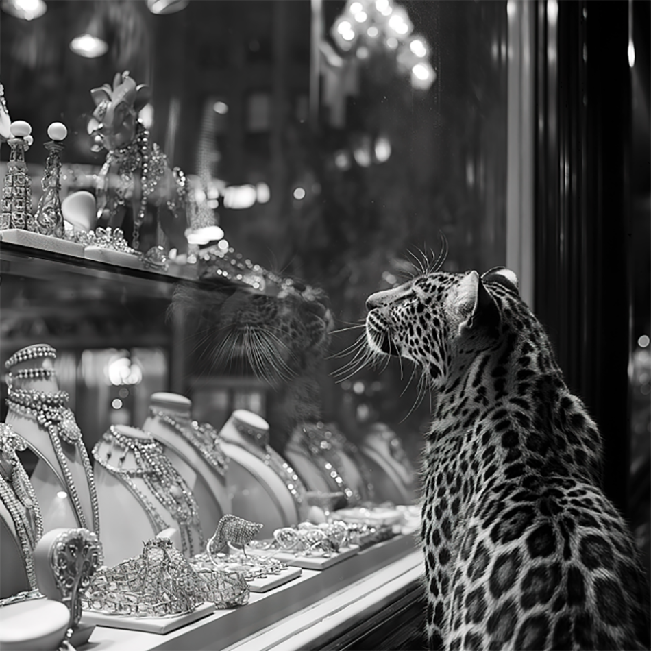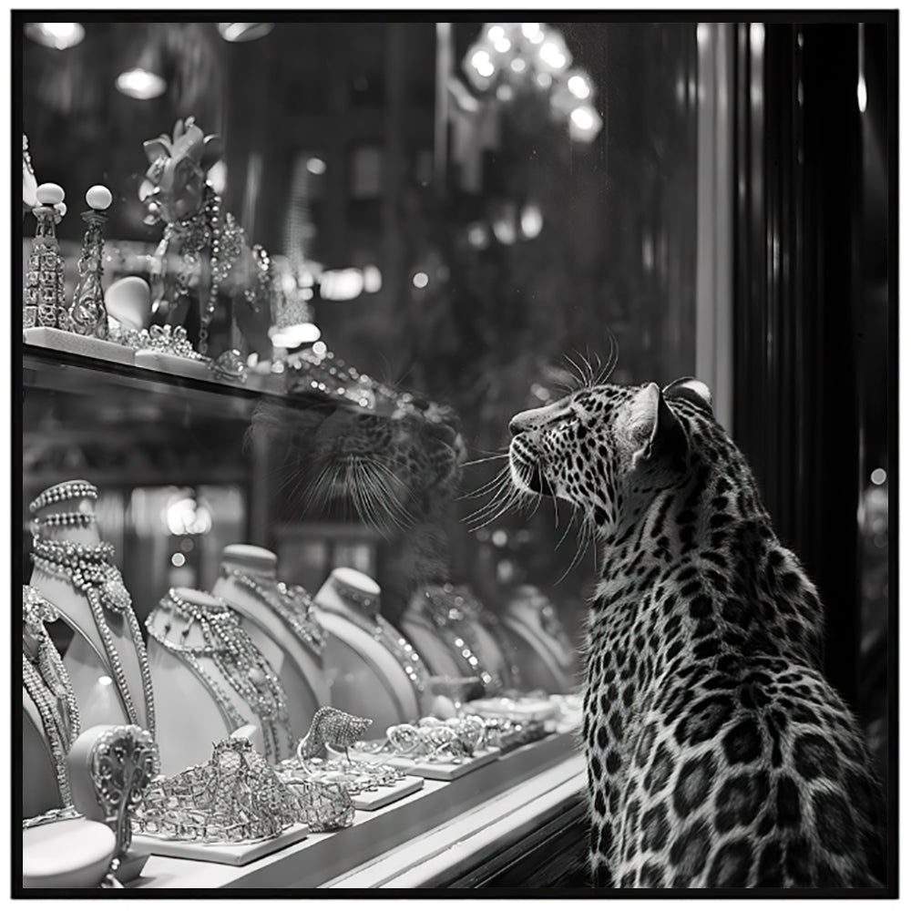Francis Wall Art captures untamed elegance, where a prowling leopard meets glittering luxury. Cinematic and provocative, this monochrome statement piece blends fashion, desire, and attitude—perfect for interiors that embrace drama, confidence, and unapologetic style with a bold editorial edge.