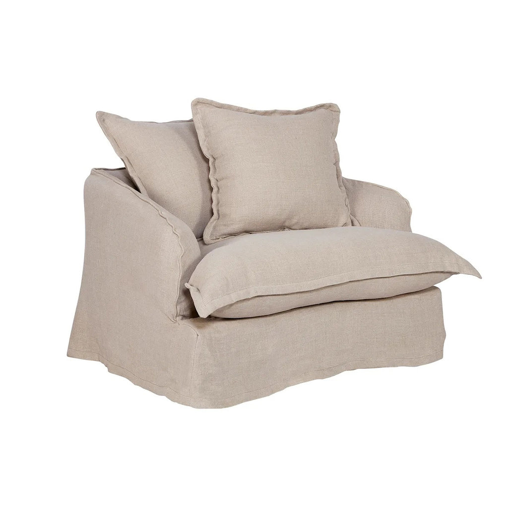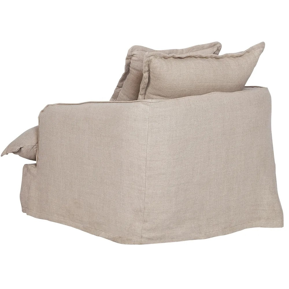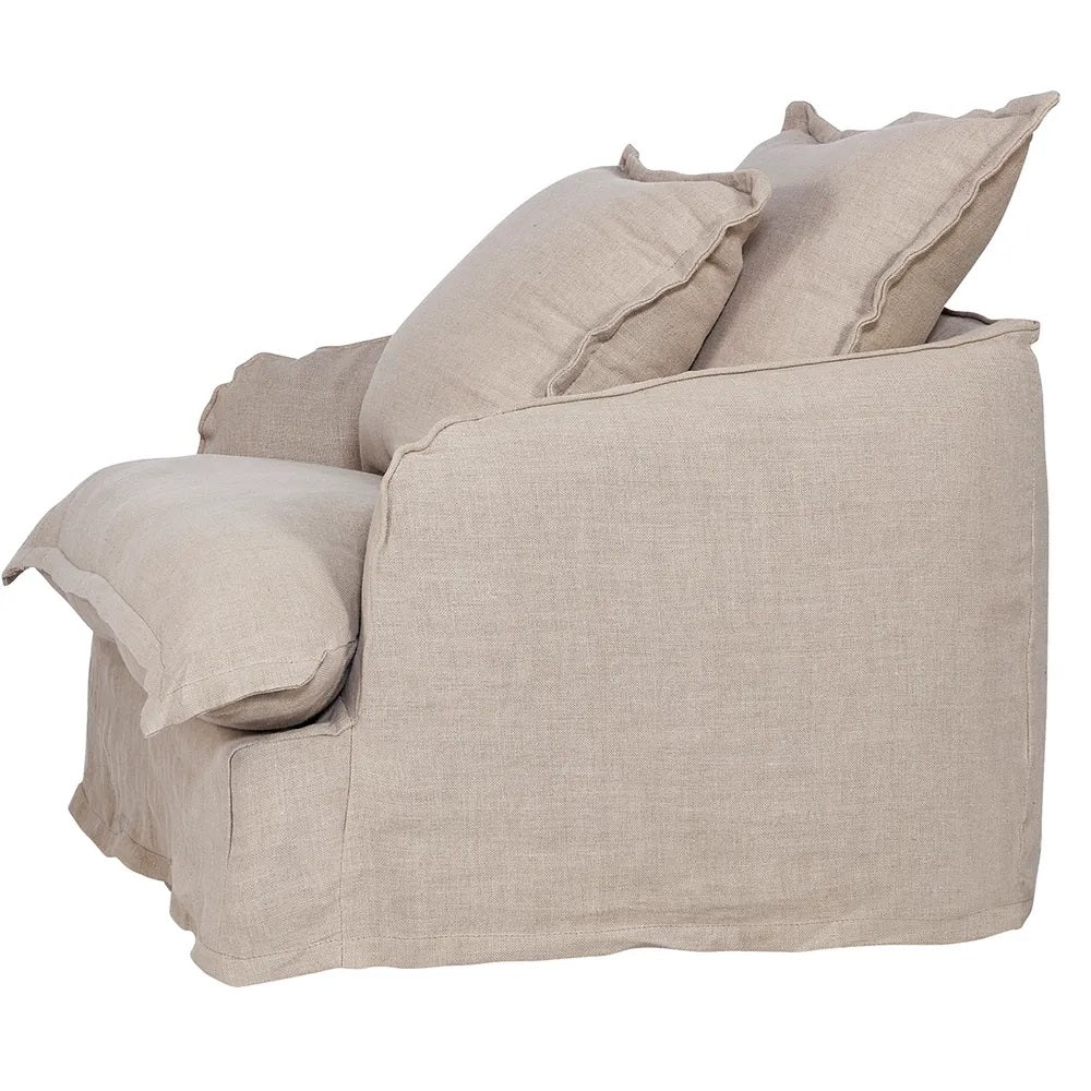 Elevate your space with the Hayman 3 Seater Slip Cover Armchair in natural, perfect for Coastal, Contemporary, and Hamptons interiors. Crafted with 100% linen upholstery, it offers effortless comfort and timeless elegance. Featuring a 2.5cm flange edge, removable base cushion, and two matching scatter cushions, the Hayman armchair blends style and practicality seamlessly.
