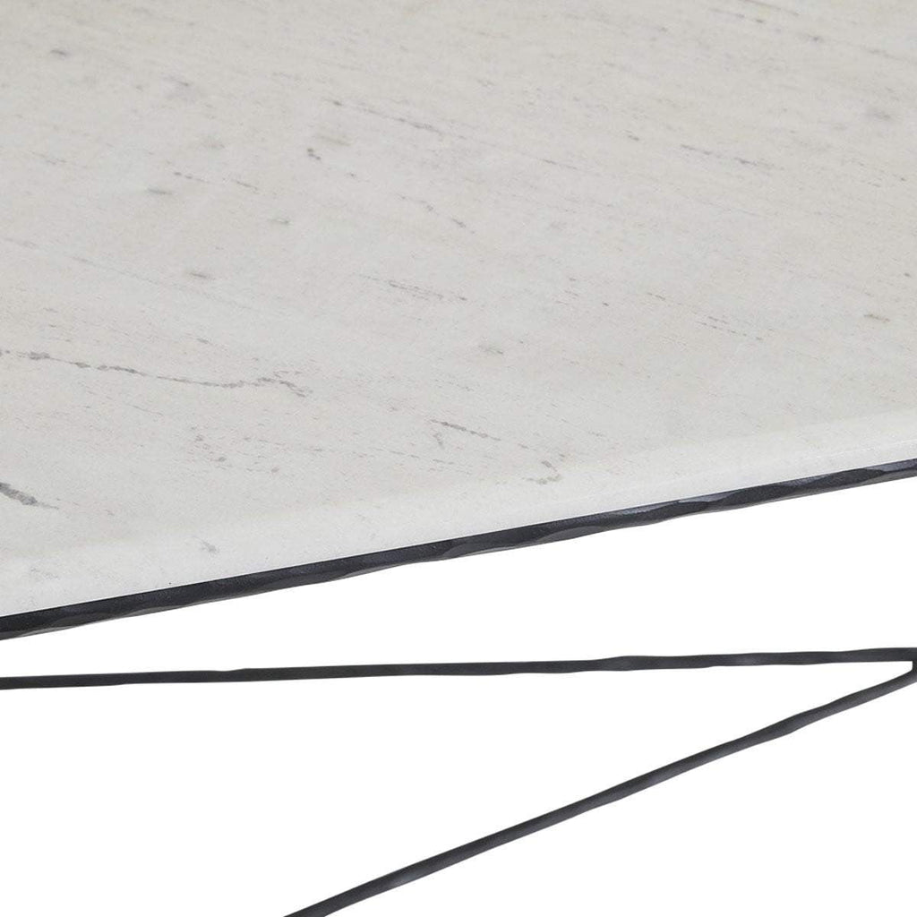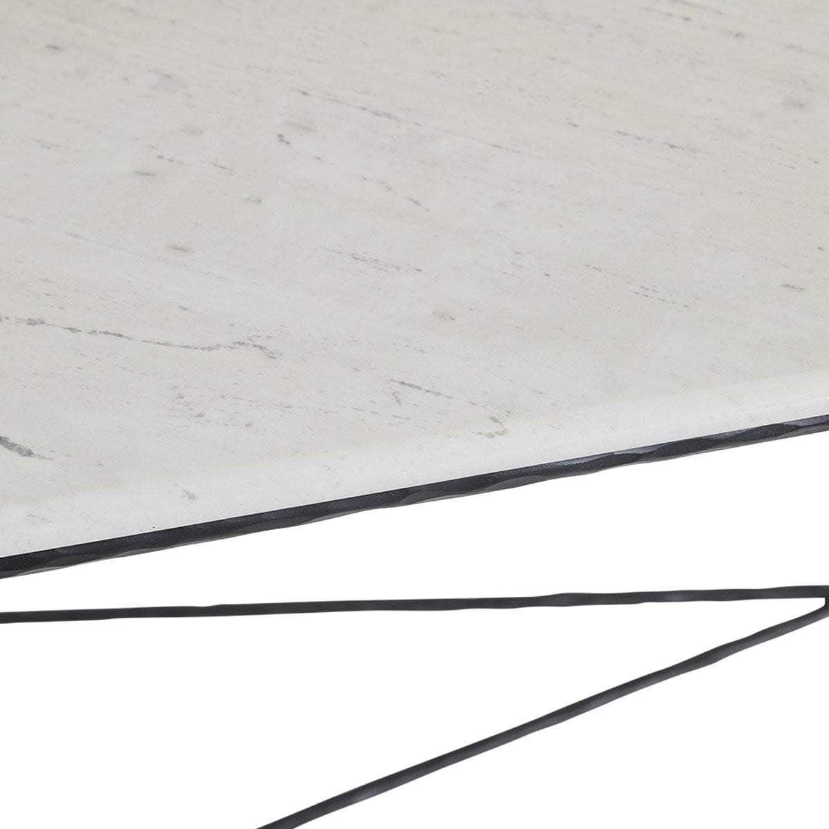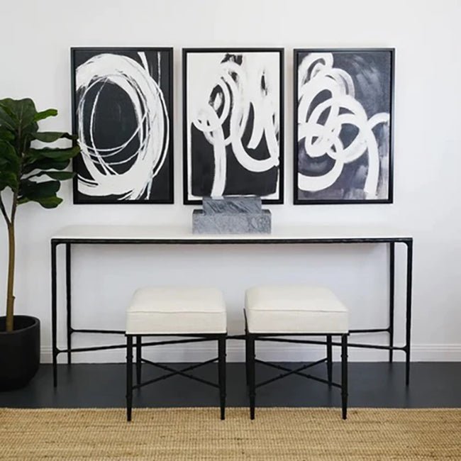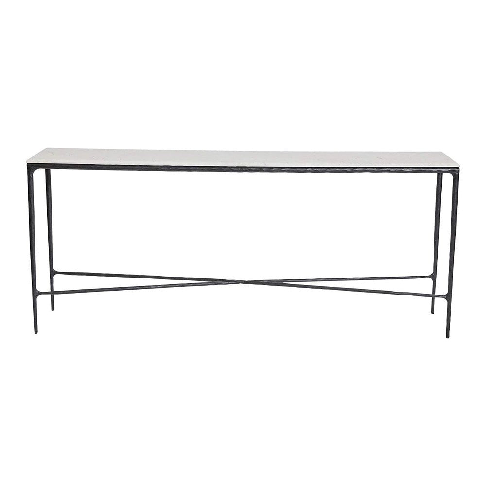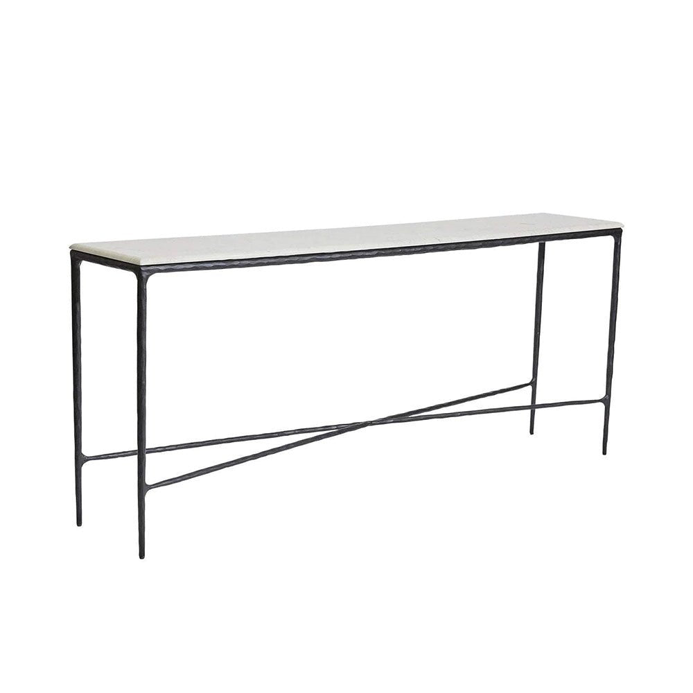 This beautifully hand-forged marble console table is finished in a sleek matte black painted finish with a unique round-edged white marble table top out of Greece. The fine and elegant detail of this console table allows for a practical and sleek design.