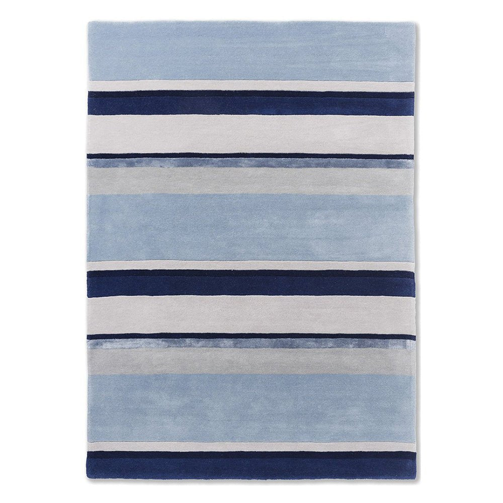 The exquisite Laura Ashley Eaton rug in shades of blue, adorned with contemporary horizontal stripes, showcases a captivating hand-tufted construction, primarily crafted from luxurious New Zealand Wool with a subtle touch of Viscose. An ideal centrepiece for your living room or study, it radiates timeless elegance and sophistication.