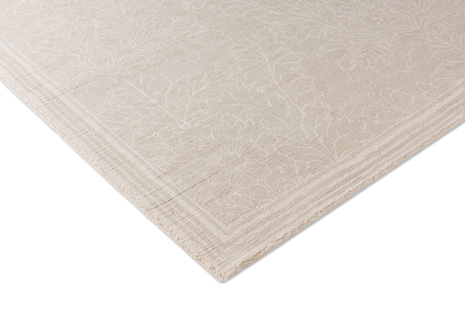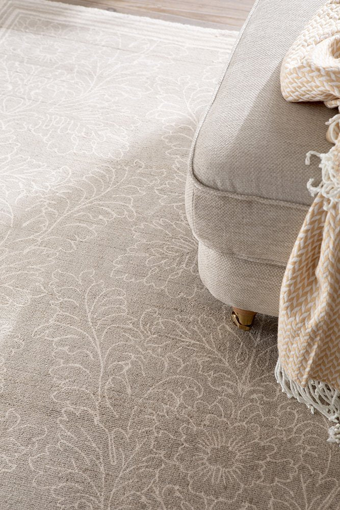 Crafted in the elegant Arts and Crafts style, the Silchester rug presents a soft and captivating damask design. Delicate textured leaf motifs are gracefully encased within hand-drawn lines, forming a charming frame. This exquisite piece is meticulously screen-printed on high-quality cotton handloom, ensuring both its beauty and durability.