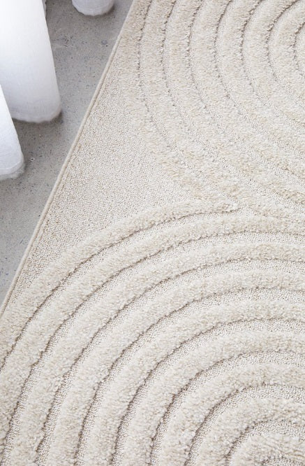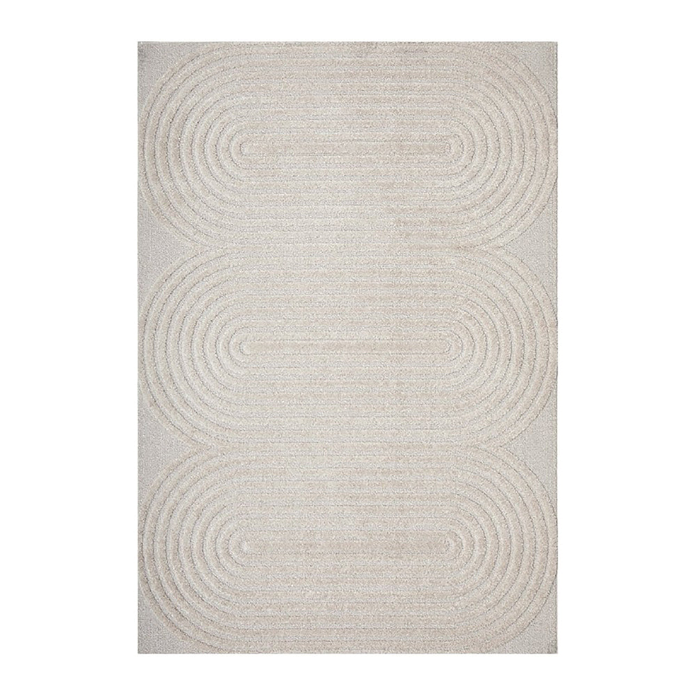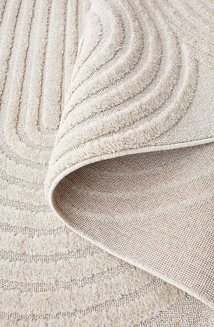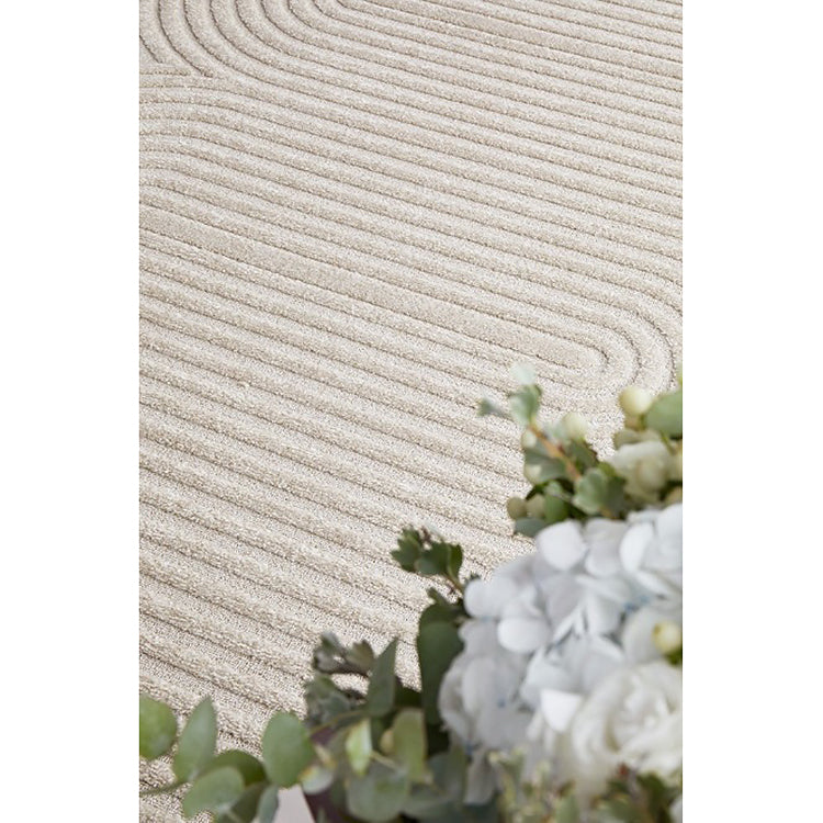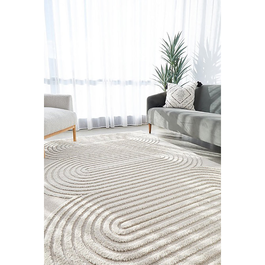 The Lola Carl beige rug blends Mid-Century inspiration with contemporary elegance, featuring a captivating pattern of curved oval shapes created through meticulous high and low pile detailing. This design element adds depth and texture, enhancing the sophisticated aesthetic of the rug. Perfect for neutral, modern, or contemporary spaces, it offers versatility and style.