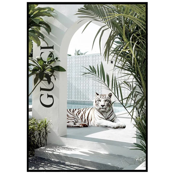 Elevate your space with the bold, fashion-inspired Louis Tiger Fashion Wall Art. Featuring a majestic white tiger lounging poolside, this animal wall art blends luxury and tropical calm with a confident aesthetic. A striking addition for interiors that embrace style, glamour, and unapologetic impact.