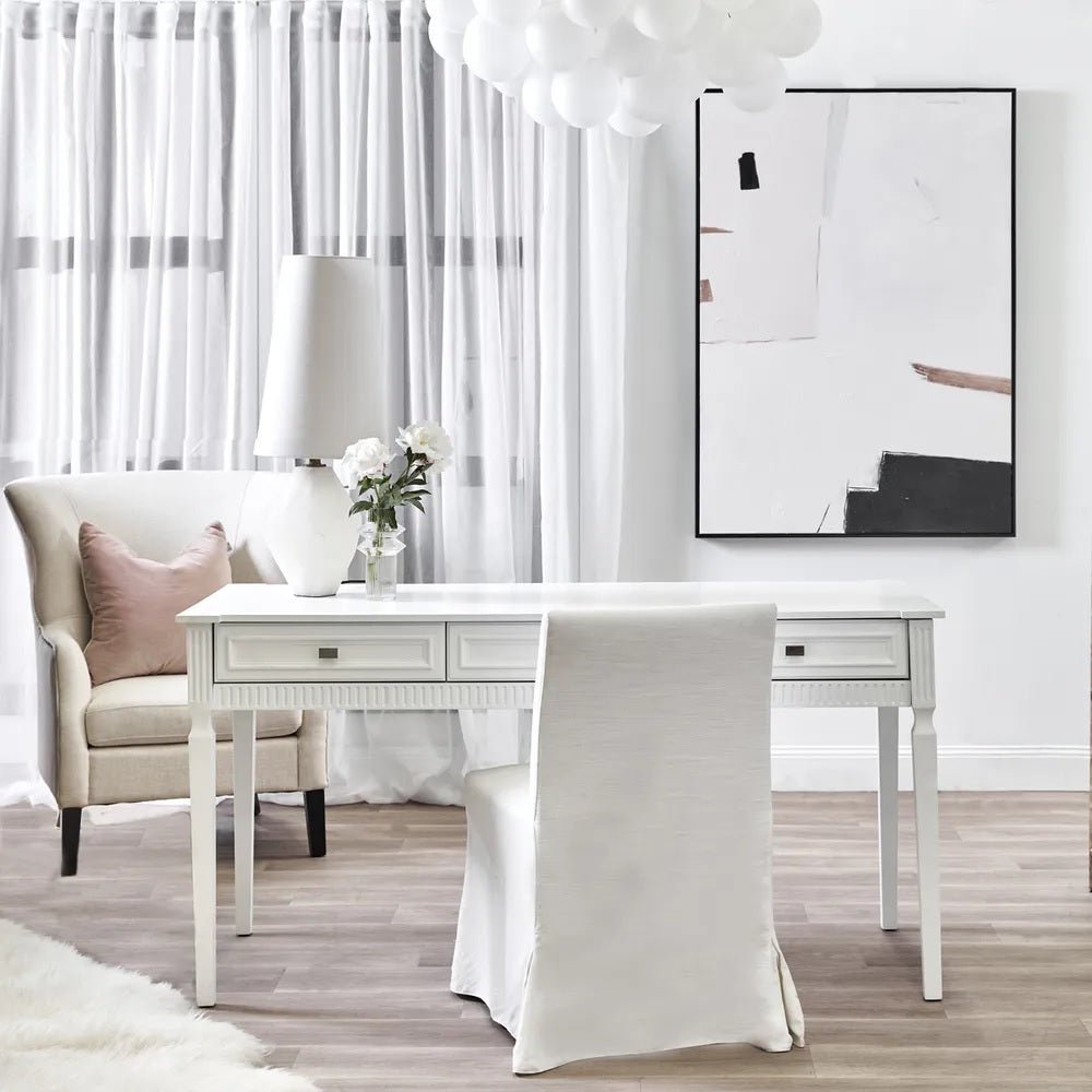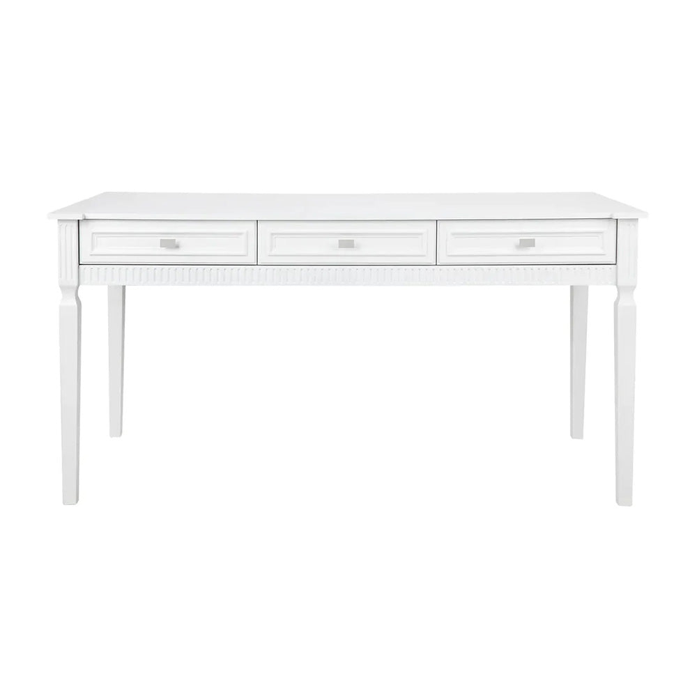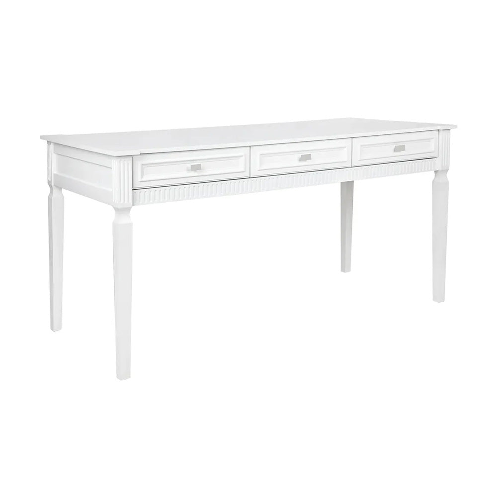 Introducing our Miami Desk, designed to embody timeless elegance. This desk features a modern classic silhouette with sleek lines, intricate molding, and slim turned legs. Its exquisite white satin finish adds an air of sophistication. Equipped with three smooth-gliding drawers, the Miami desk seamlessly combines style and functionality. With its generous proportions, this desk incorporates all the essential elements, making it the perfect upgrade for your office or studio work space.
