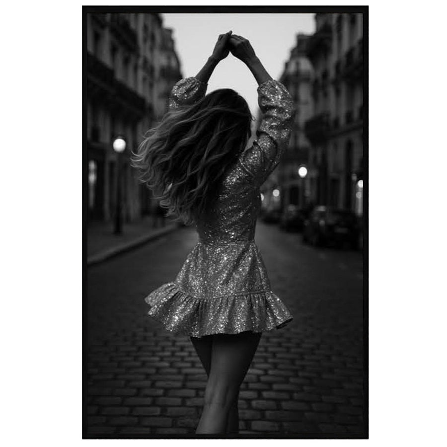 Modern Femininity captures confident elegance in motion, featuring a shimmering silhouette moving through a softly lit European street. The playful sparkle and graceful movement evoke contemporary glamour, bringing energy, sophistication, and a touch of after-dark allure to refined modern interiors.