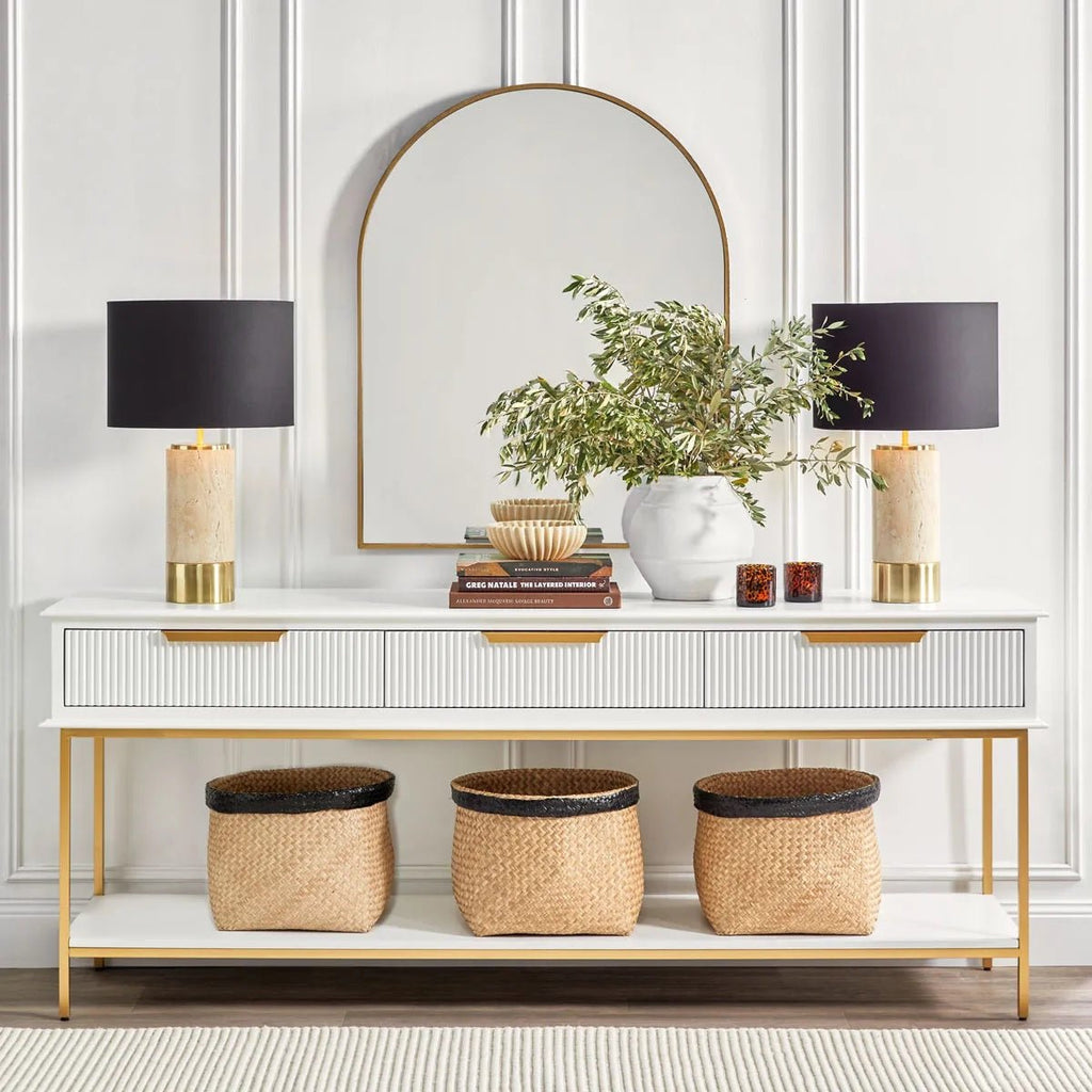 Embrace understated opulence with our Paola table lamp, boasting a divine cylindrical base crafted from natural travertine and brass finish. Adorned with a striking black linen drum shade enhanced by a gold reflective inner lining, this lamp exudes effortless elegance. The perfectly proportioned Paola table lamp effortlessly transcends styles, making a seamless transition from classic to contemporary settings.