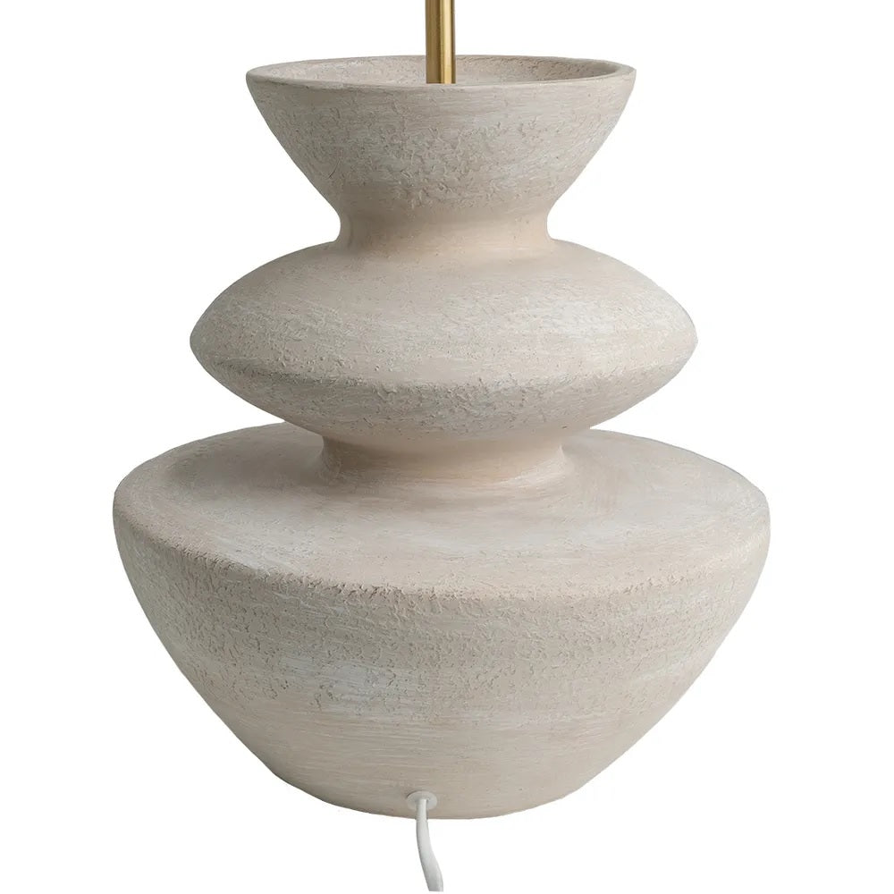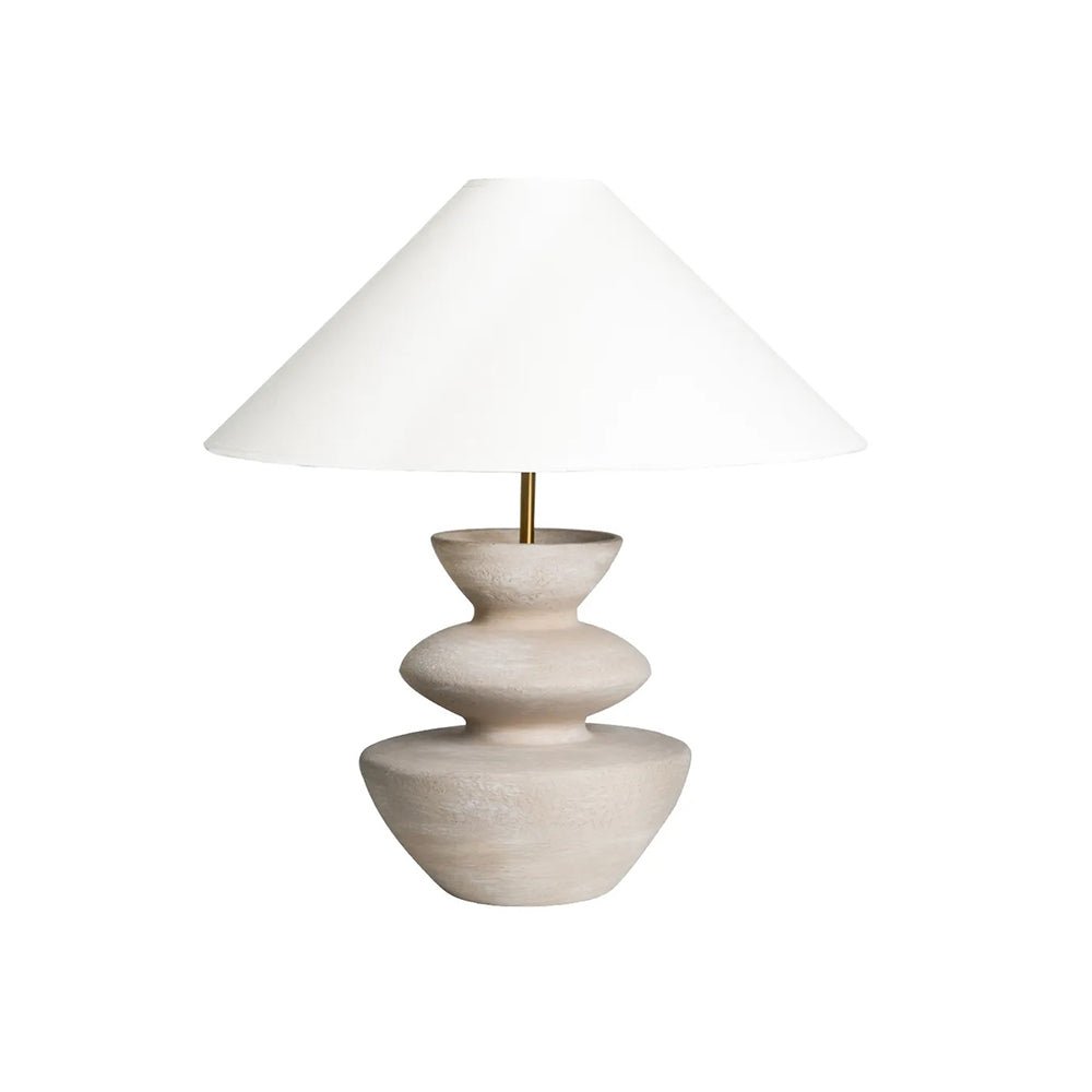 Infusing interiors with earthen warmth, the striking sculptural form of the Perama table lamp is enhanced by its raw, tactile finish. Handcrafted in ceramic, the chalky natural tones add organic texture and are complimented by a tapered white shade in a soothing matte white.