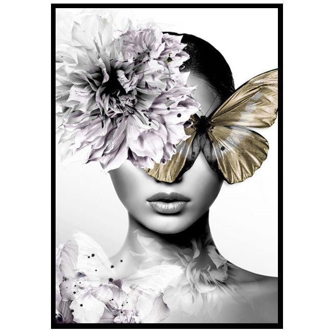 Ramona Silk (Pink) Fashion Wall Art blends elegance and mystery, featuring a monochrome beauty adorned with a delicate flower and gilded butterfly. A striking fusion of high-fashion aesthetics and artistic allure, this captivating piece adds a luxurious, avant-garde statement to any space.