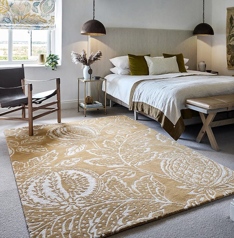 Exquisitely created, the Sanderson San Cantaloupe rug weaves a tapestry of vivid, retro charm into your abode. Crafted from the finest hand-tufted new wool, its deep ochre hues dance with ivory botanical patterns, offering a sumptuous underfoot wherever you choose to place the rug.