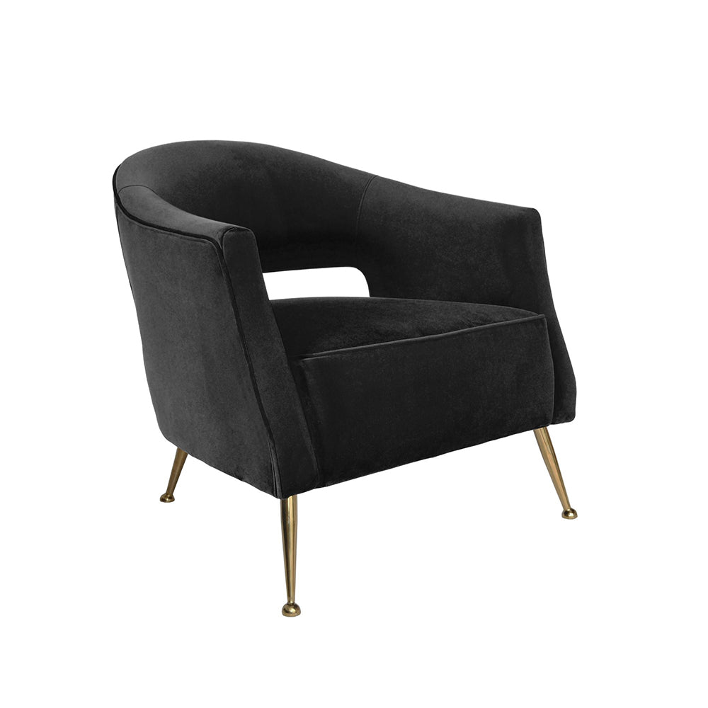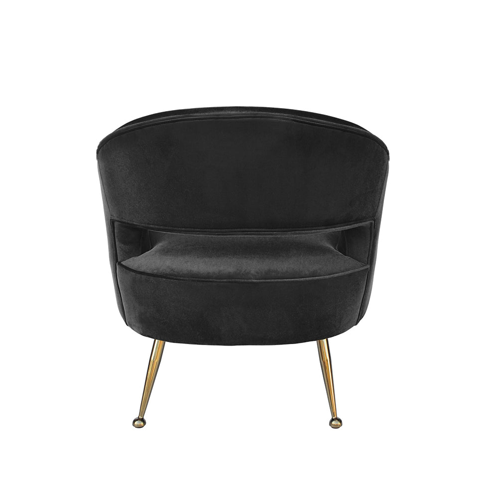 Indulge in the opulence of this exquisite black velvet armchair, featuring a sumptuous curved back and decadent gold legs. Sink into its comfortable seating and feel the allure of its stylish design, beckoning you to unwind and surrender to its luxurious embrace. A statement piece that will elevate the ambiance of any interior, this armchair exudes sophistication and with a subtle touch of glamour.