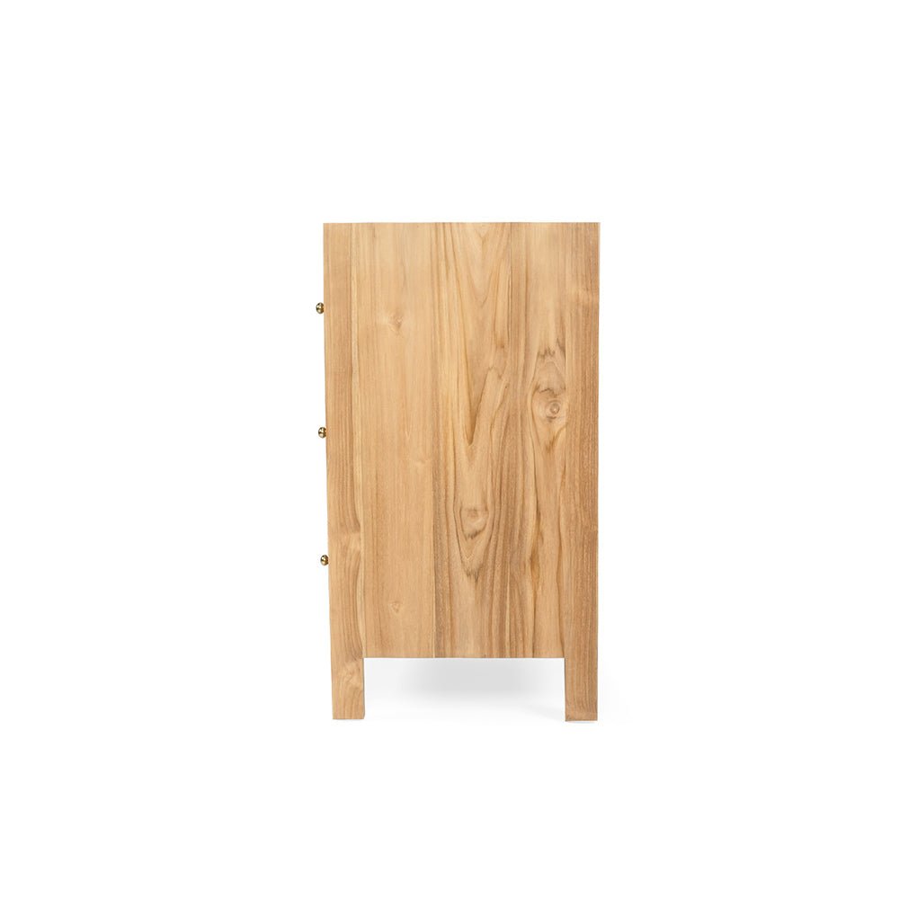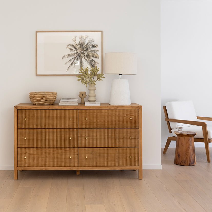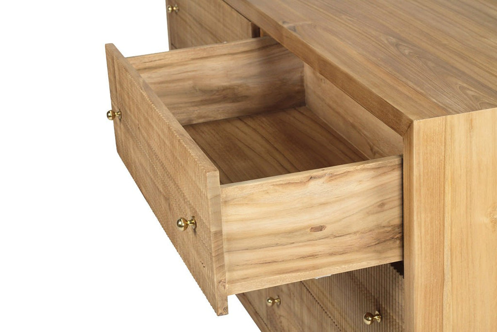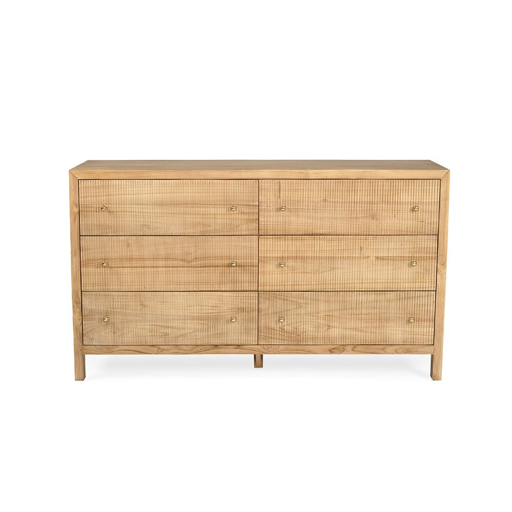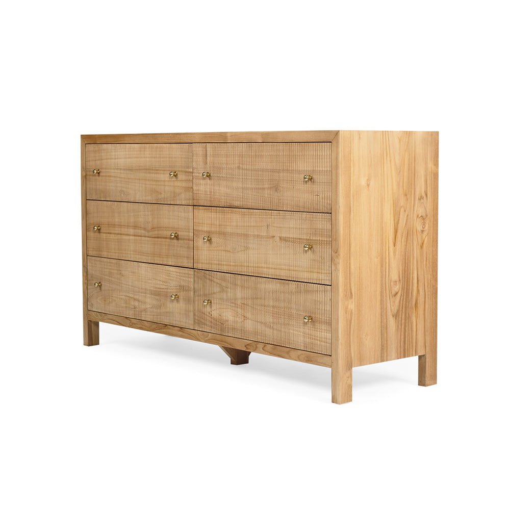 The Taylor Chest of Drawers in natural, meticulously handcrafted from solid teak, offers a blend of functionality and style with its six spacious drawers. This piece is both sturdy and distinctive in its construction and aesthetic. Its unique design is sure to complement and complete any bedroom decor, specially a Coastal style setting, making it an essential addition to your personal space.