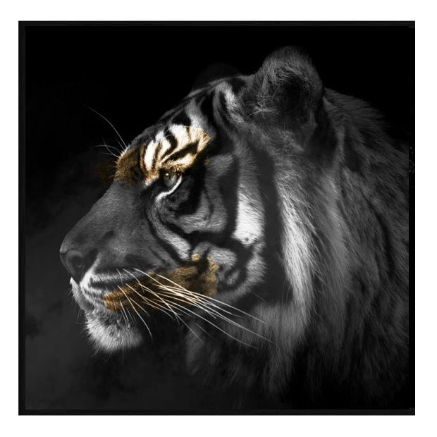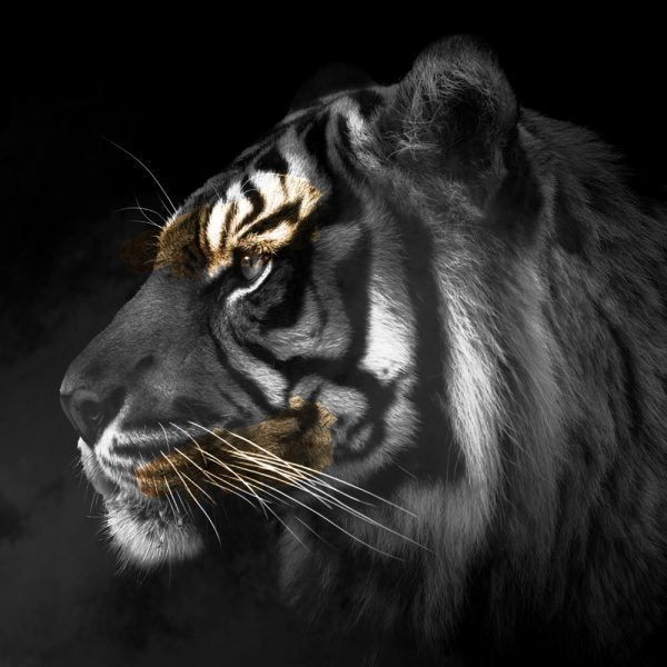 Discover a magnificent piece of art that exudes grace, strength, and beauty - a black and white and shades of gold image of a tiger. This stunning piece captures the raw power and majesty of this elusive and revered feline like no other.