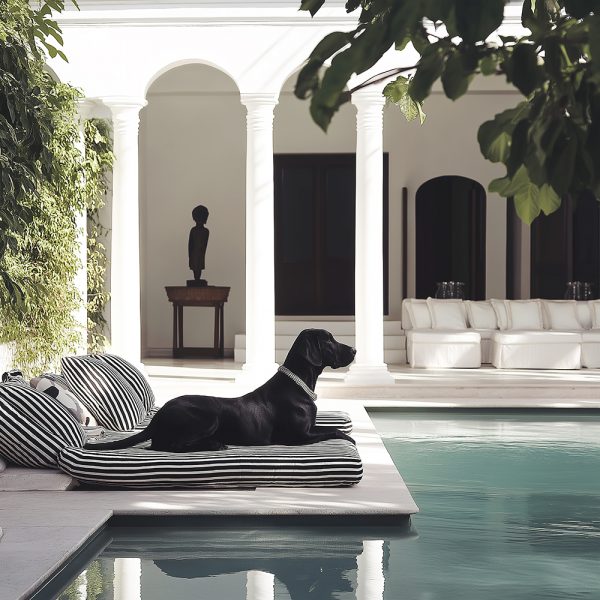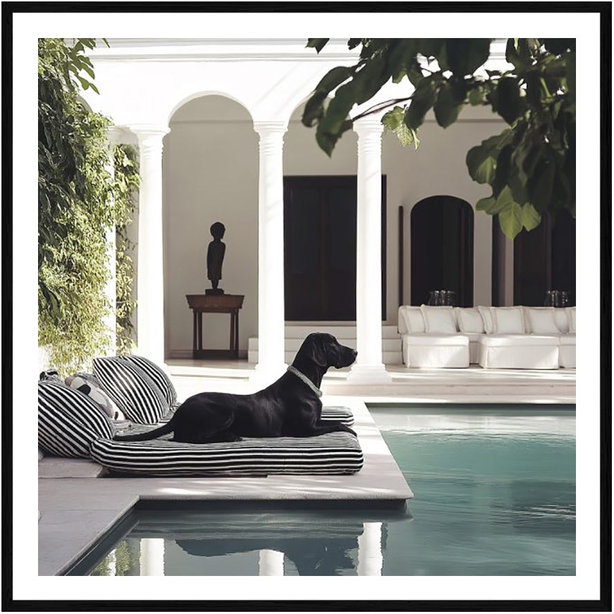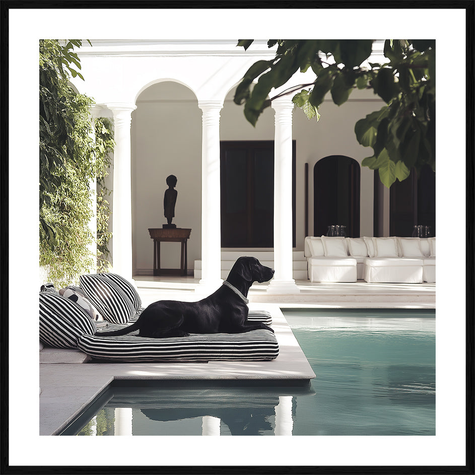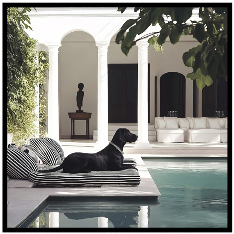 Meet Winston—the chic black Great Dane lounging poolside in a regal Mediterranean escape. Surrounded by grand archways, lush greenery, and sculptural detail, this striking wall art blends classic elegance with a dash of quirky charm. A true conversation piece, Winston brings relaxed glamour, architectural beauty, and playful sophistication to interiors craving a bold, stylish statement.